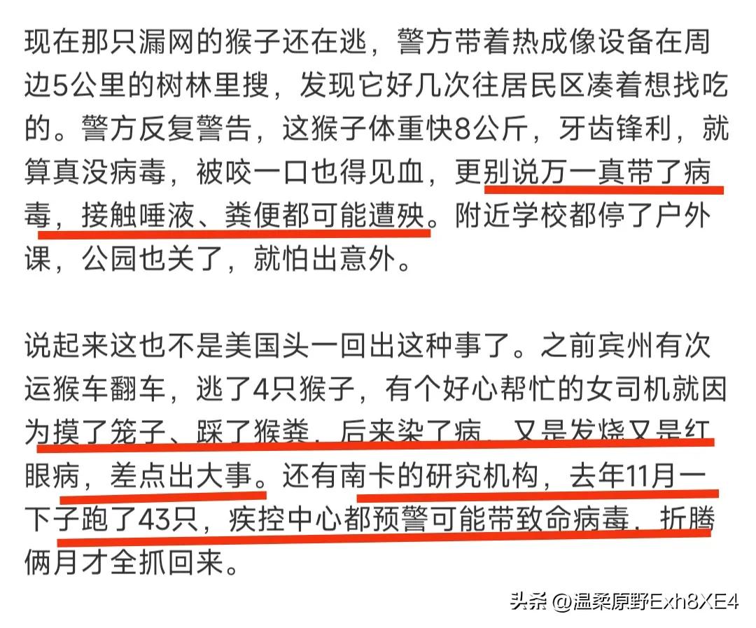 又来?美国一运猴卡车侧翻,有6只实验用猴趁机逃跑了。刚开始警方从司机口中得知,这些猴子携带包括丙肝、疱疹、新冠病毒等病毒,遂对外宣称让周围人警惕,已射杀5只,还有一只逃入林中,还在找寻中 但紧跟着,杜兰大学声称,这些实验用猴只是饲养在杜兰大学生物研医学究院中心,属于第三方所有,且不具有传染性!据查,这两年美国就发生过两起携带病毒的猴子跑出来的事故,真是拿生物安全当儿戏了吗[发怒]