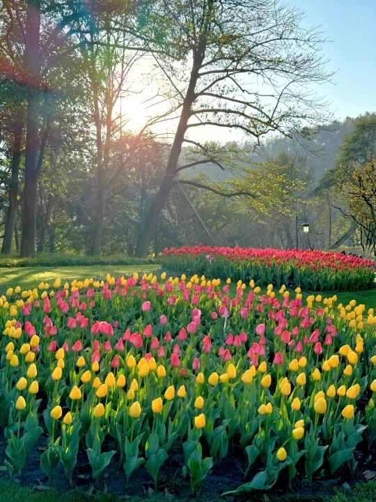 早上9点前,光线柔和,还有晨雾和露珠的加持,郁金香更显娇艳 ;傍晚17点 - 18点,夕阳余晖洒在花上,氛围感拉满 。