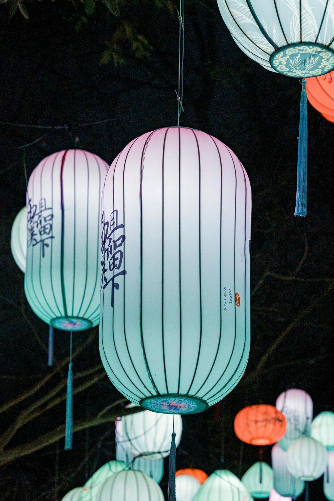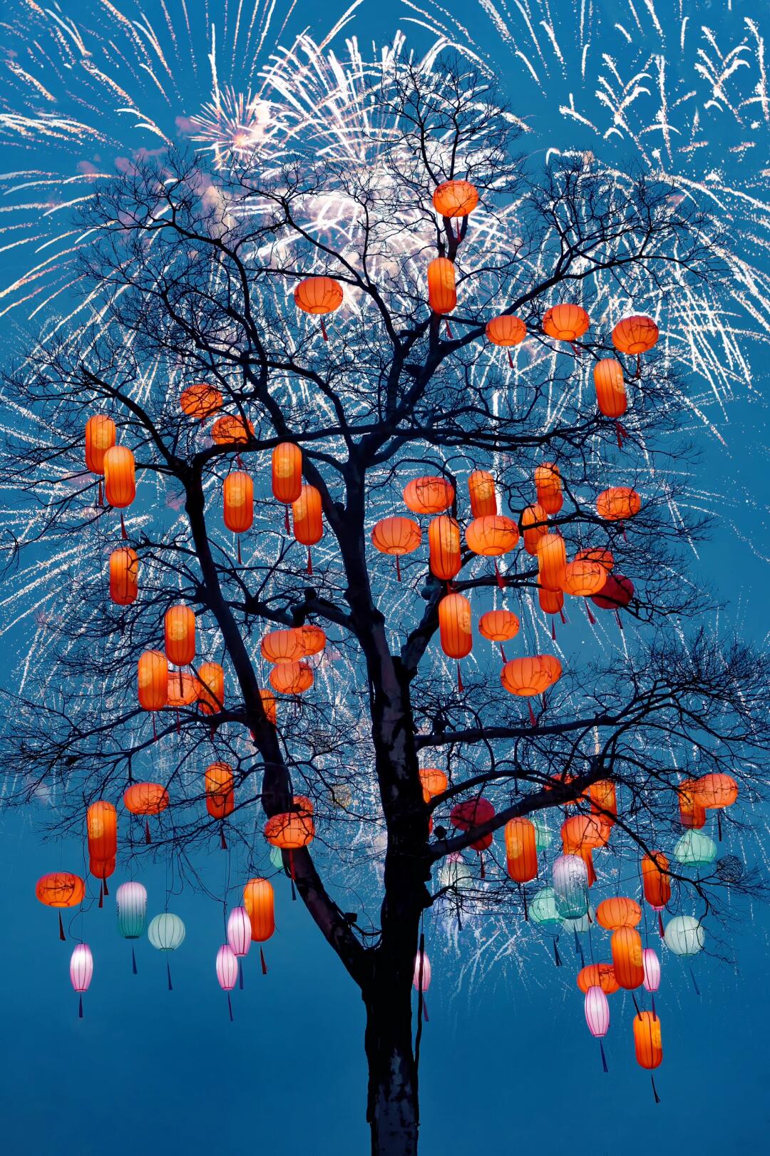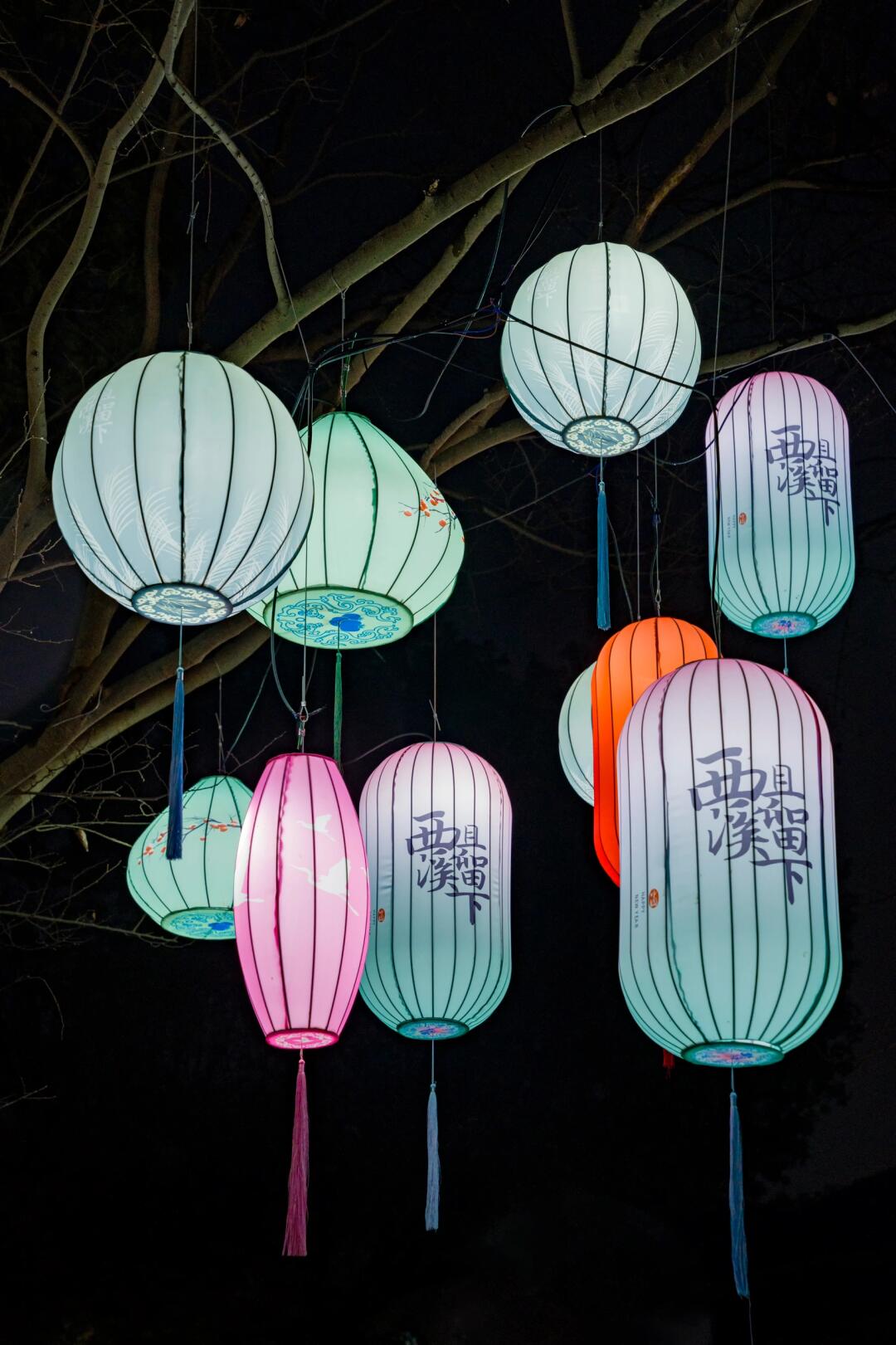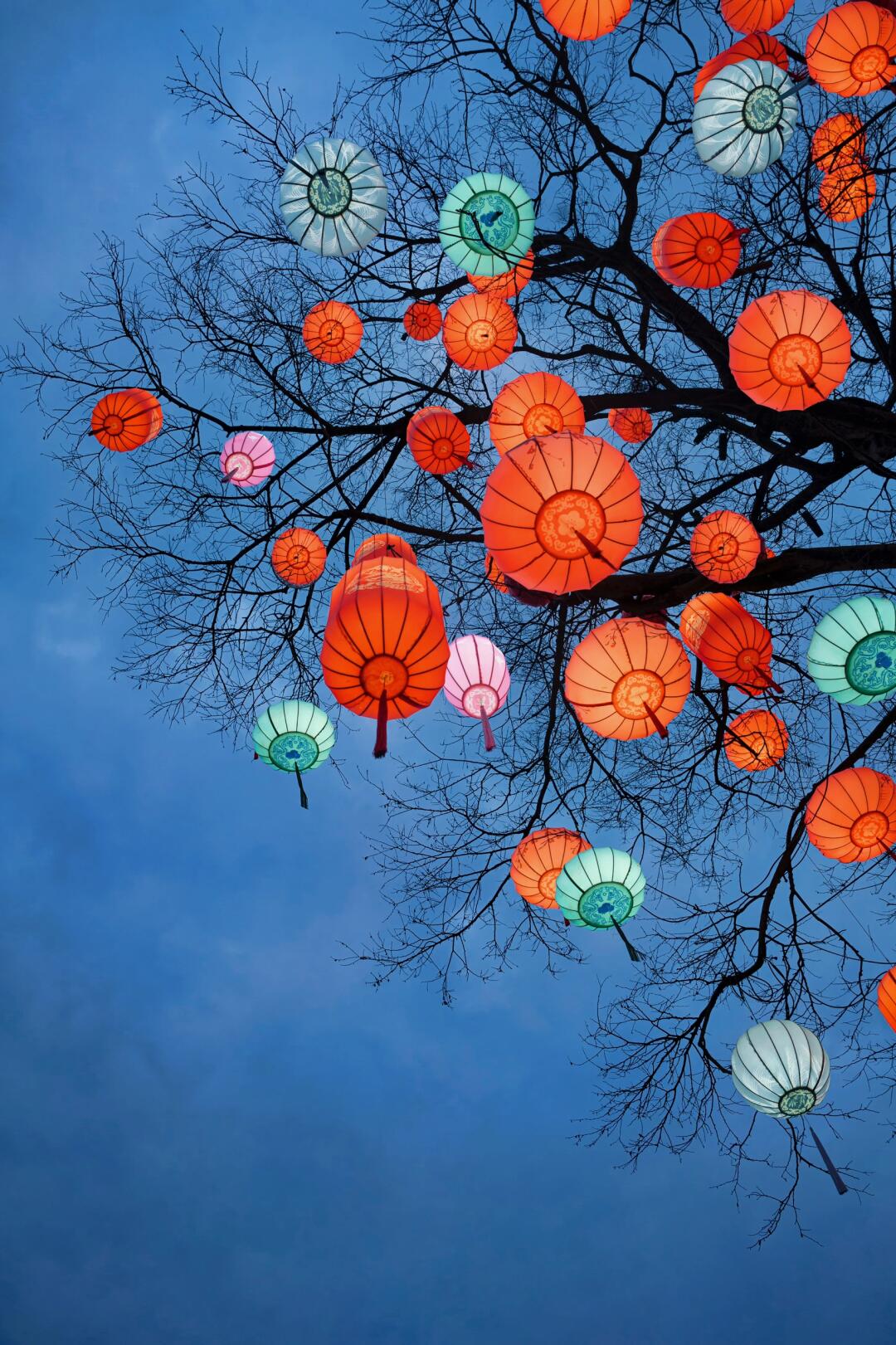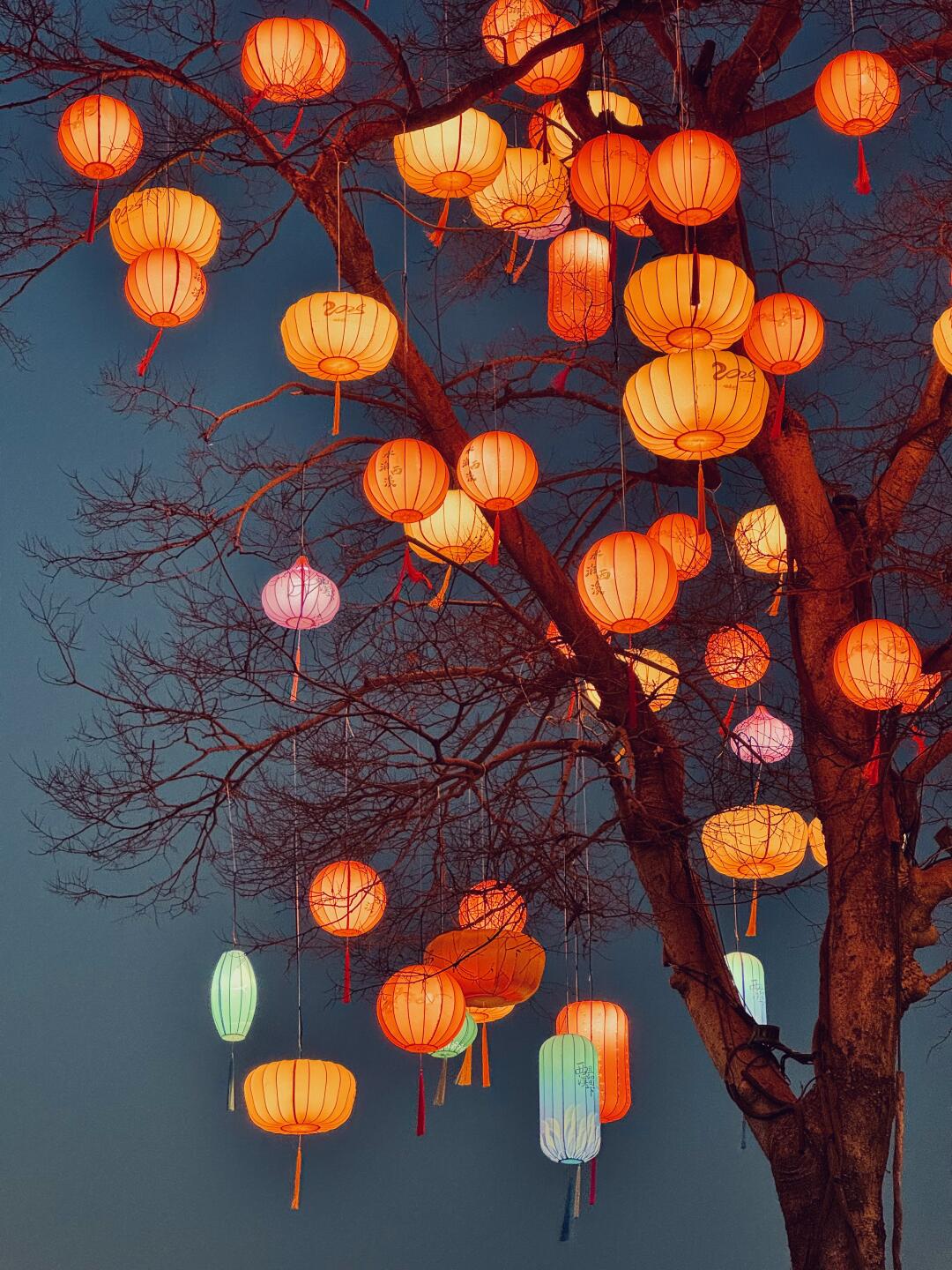 大树枝头挂满各色的灯笼,