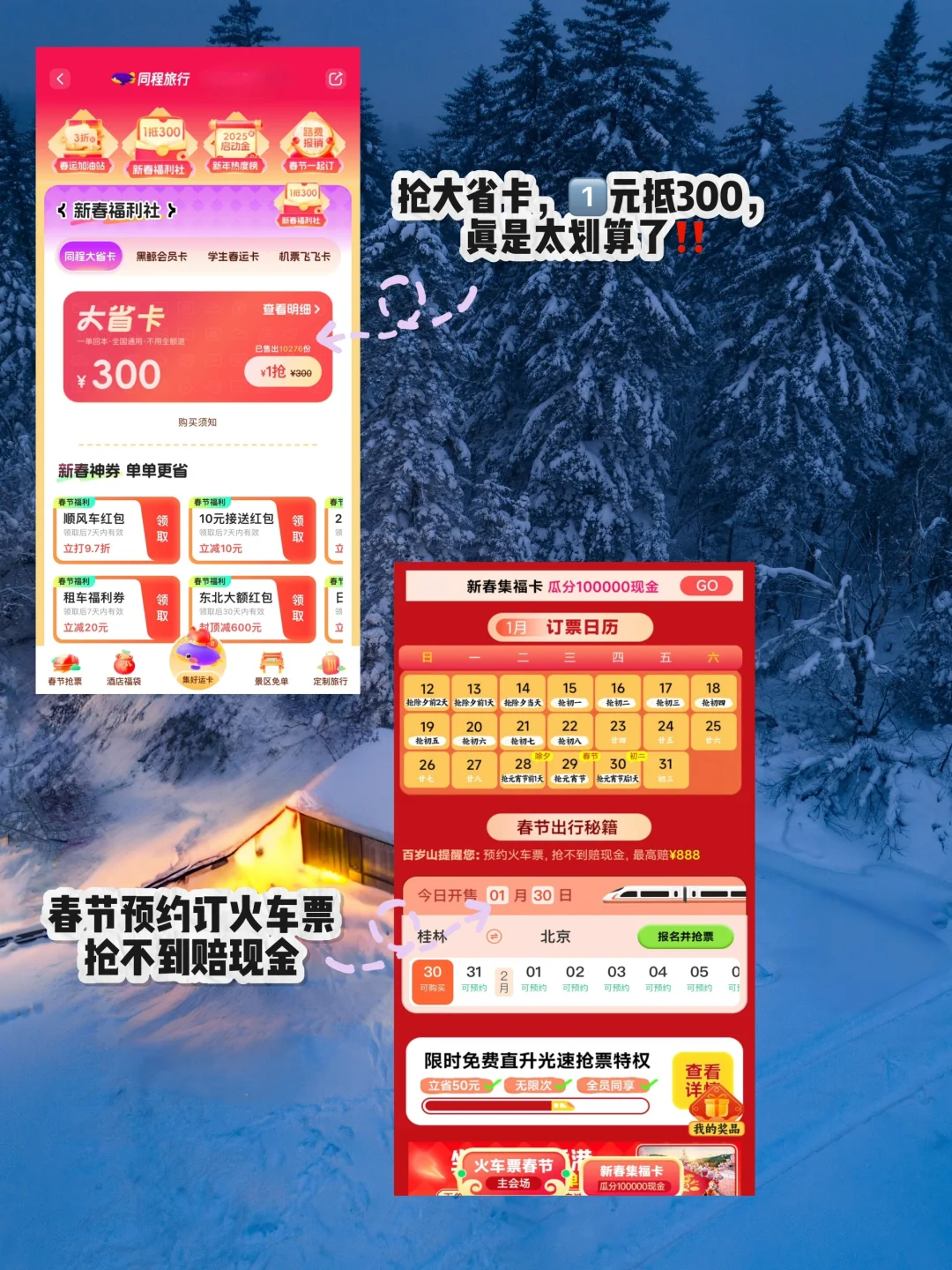 趁着春节假期又可以和朋友家人一起相约出门旅行,提前做好旅途规划才能玩的更放心,我出门旅行一直都用同程旅行,现在更有福利活动,集好运卡可以兑换各种福利好礼以及瓜分百万年终奖,💕也别忘了抢大省卡1元抵300一单就回本,门票酒店火车票电影院都能用太值了,提前预约火车🚞票抢不到还有赔,这种好事怎么能错过。