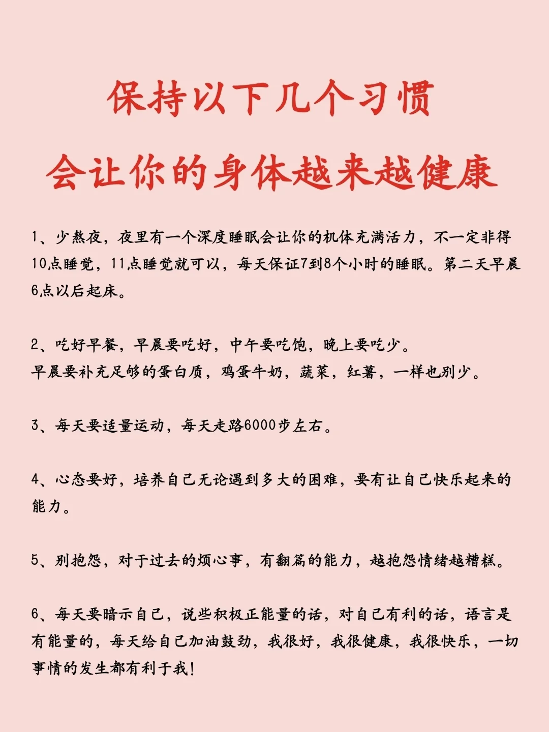 6、每天要暗示自己,说些积极正能量的话,对自己有利的话,语言是有能量的,每天给自己加油鼓劲,我很好,我很健康,我很快乐,一切事情的发生都有利于我!