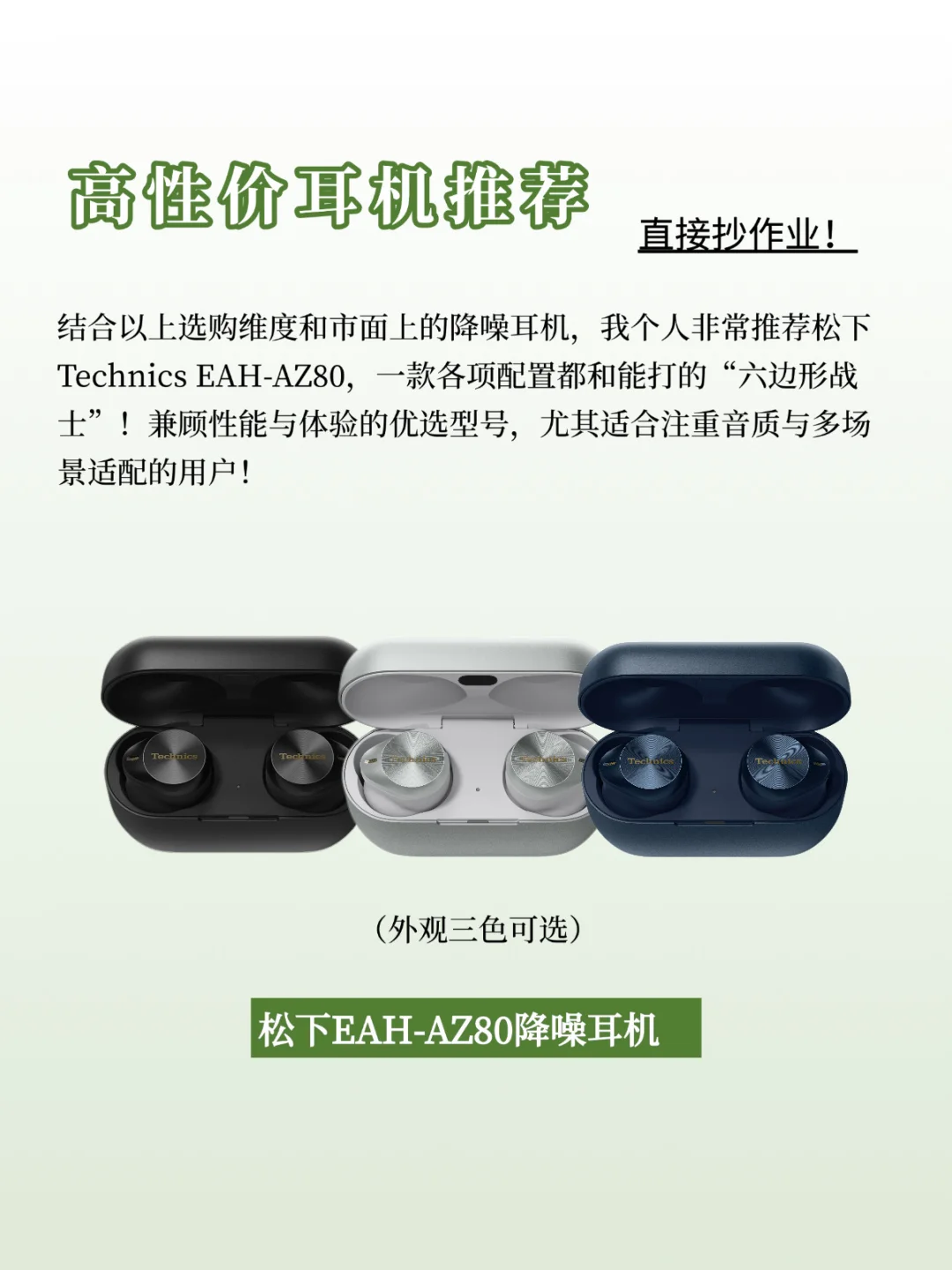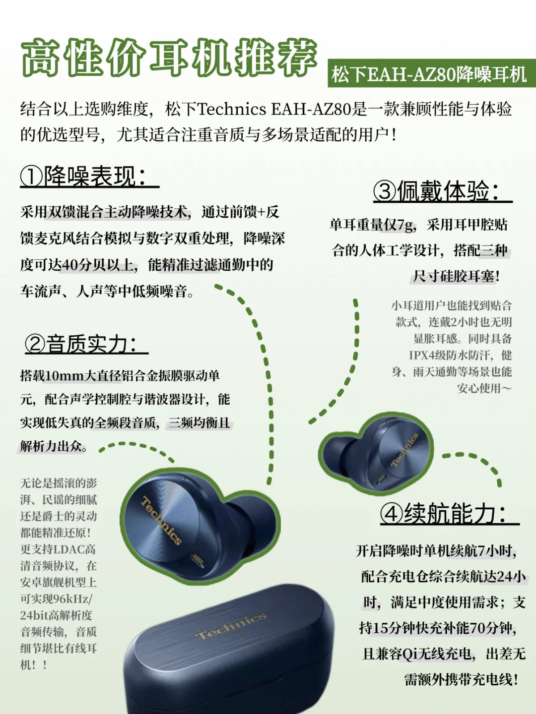 结合以上选购维度和市面上的降噪耳机,我个人非常推荐松下Technics EAH-AZ80,一款各项配置都和能打的“六边形战士”!兼顾性能与体验的优选型号,尤其适合注重音质与多场景适配的姐妹!