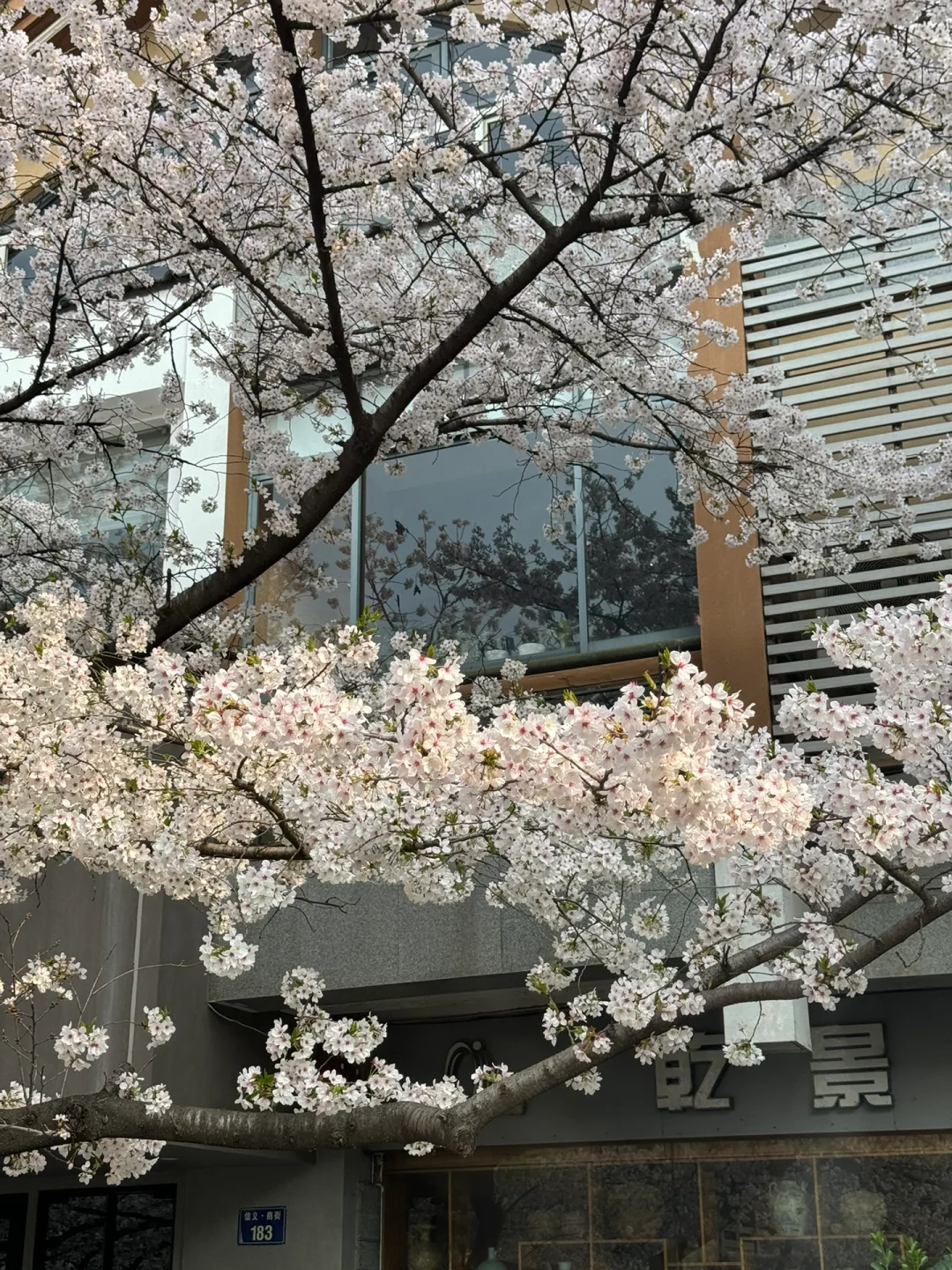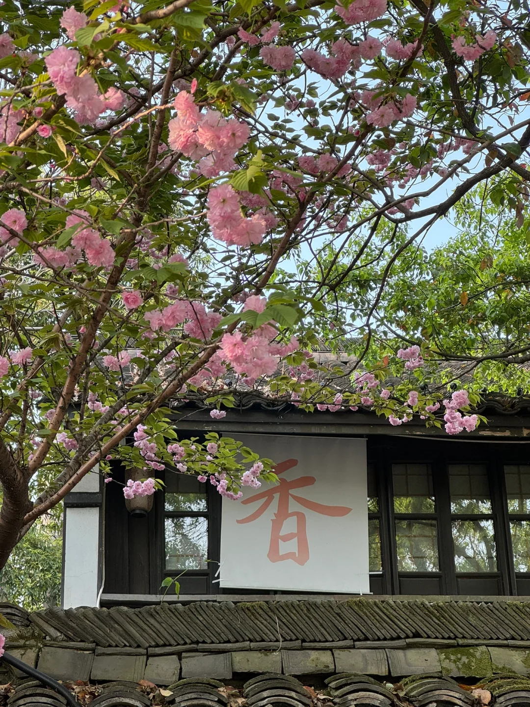 粉红花朵与古建筑相得益彰