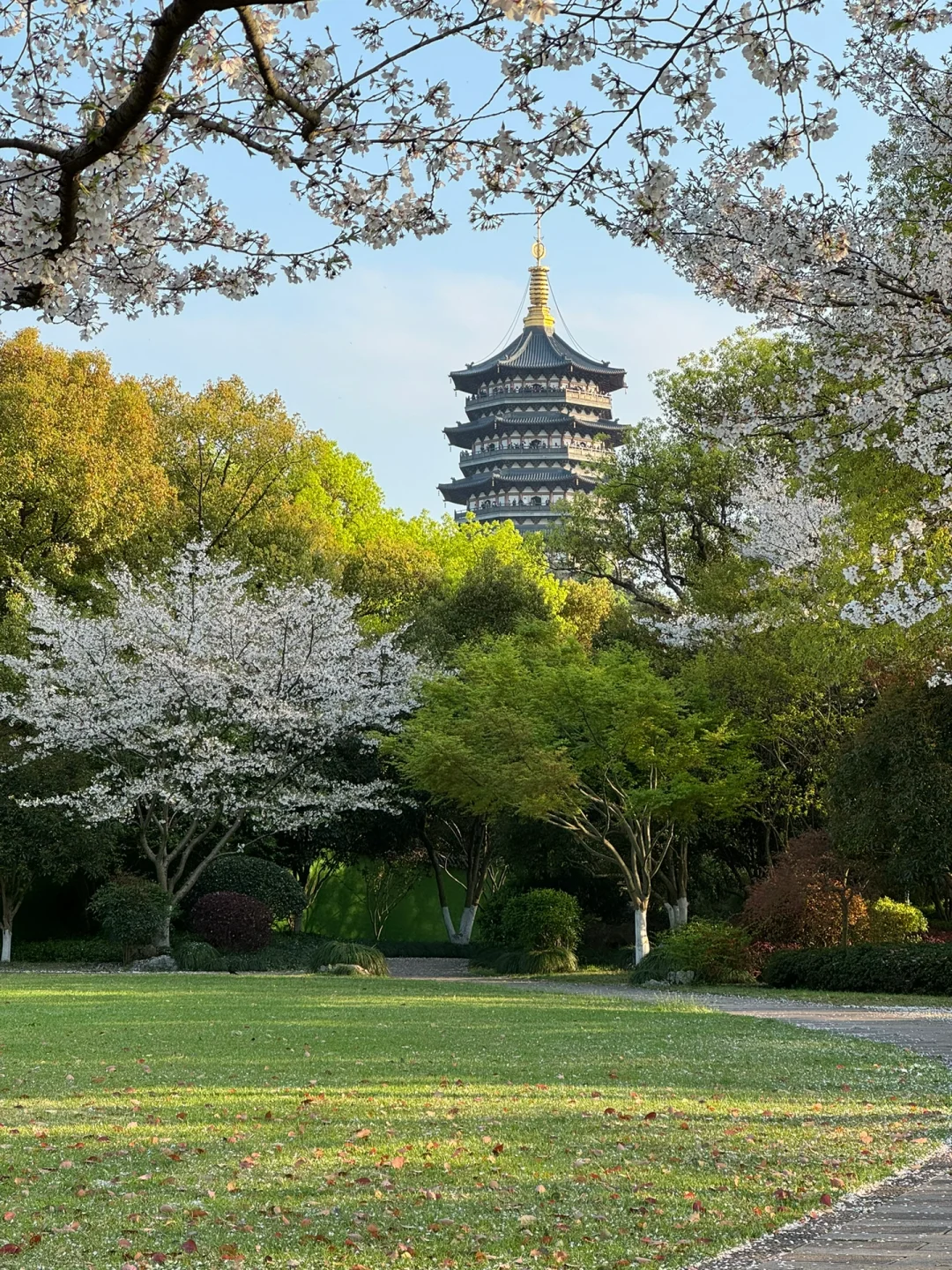西湖边湖光山色与樱花相映成趣