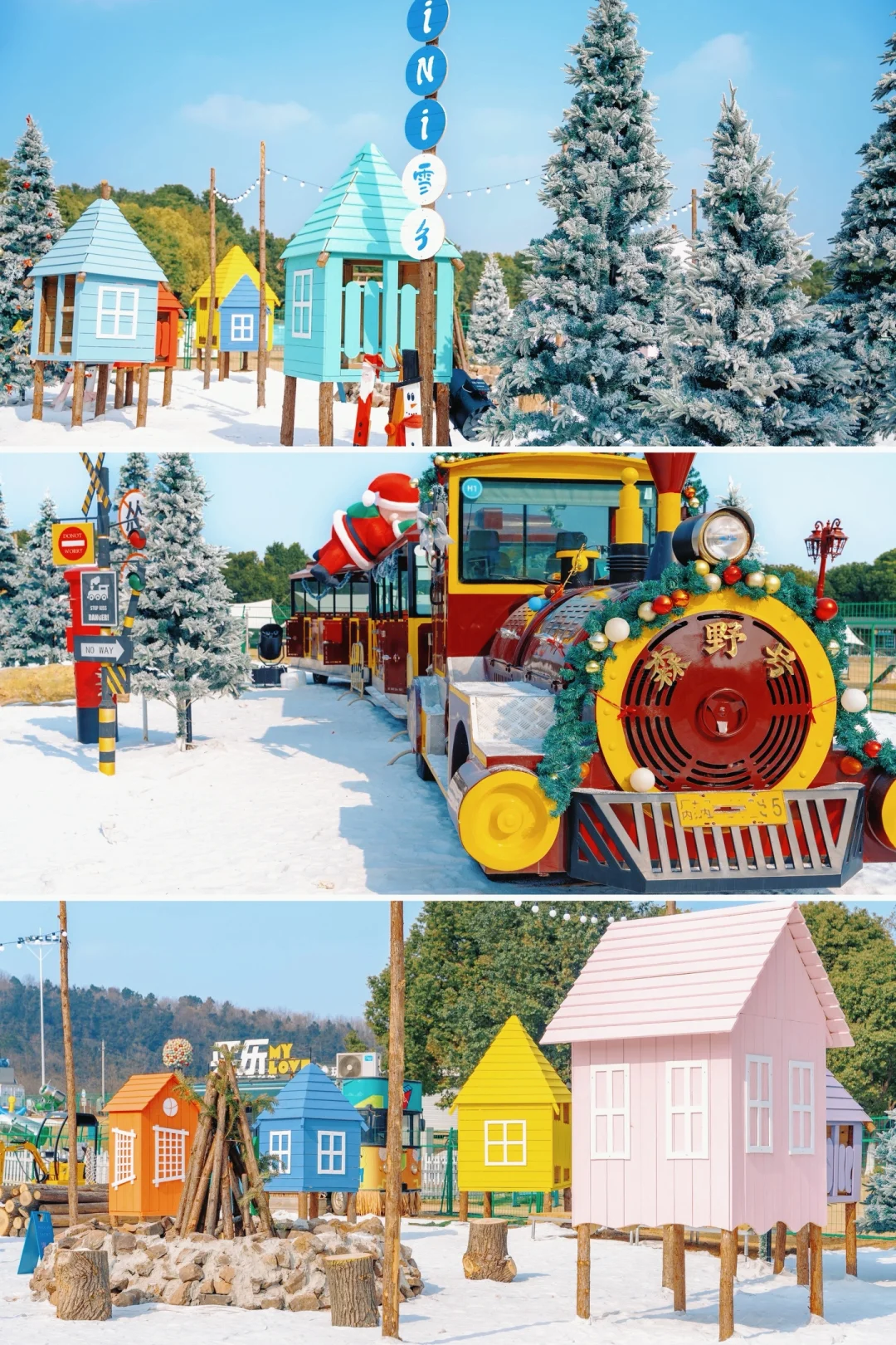 雪国列车和mini雪乡彩色屋位置在雪国入口处,周末会有下雪场景和俄罗斯棕熊合影打卡,小火车、彩色小木屋和森林拍照打卡很出片