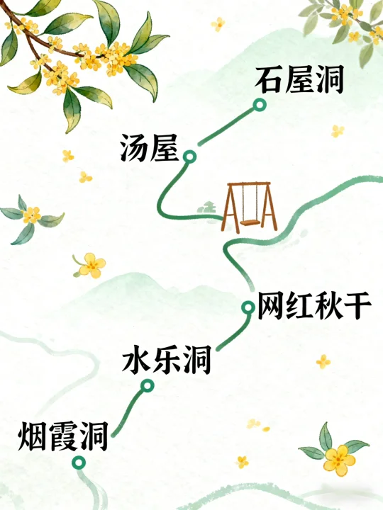 石屋洞 → 汤屋 → 白鹤峰(网红秋千)→ 水乐洞 → 烟霞洞