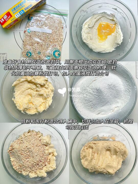 1️⃣准备好食材.熟花生仁放密封袋,用擀面棍压碎备用.软化好的黄油加糖粉压拌顺滑搅打匀,再加入蛋液搅打吸收,筛入低粉、泡打粉,加入奶粉切拌匀加入花生碎抓捏按压成团