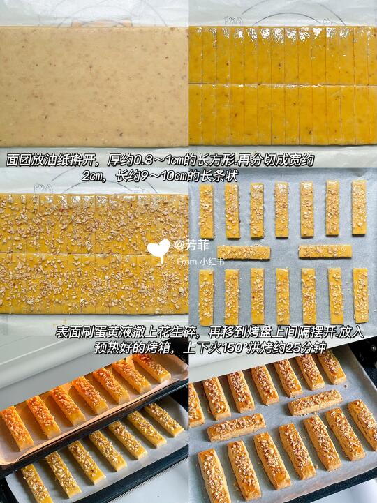 2️⃣移到油纸上擀开,厚约0.8~1㎝.均匀切小条约宽2㎝长9~10㎝,表面刷点蛋黄液,撒上熟花生碎.移到烤盘间隔摆开