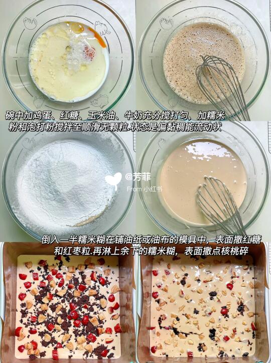 2️⃣模具铺好油布或油纸,先倒入一半糯米糊撒上另一部分红糖,再撒上切颗粒的红枣,也可以按喜好加坚果.再淋入另一半糯米糊,表面撒点核桃碎