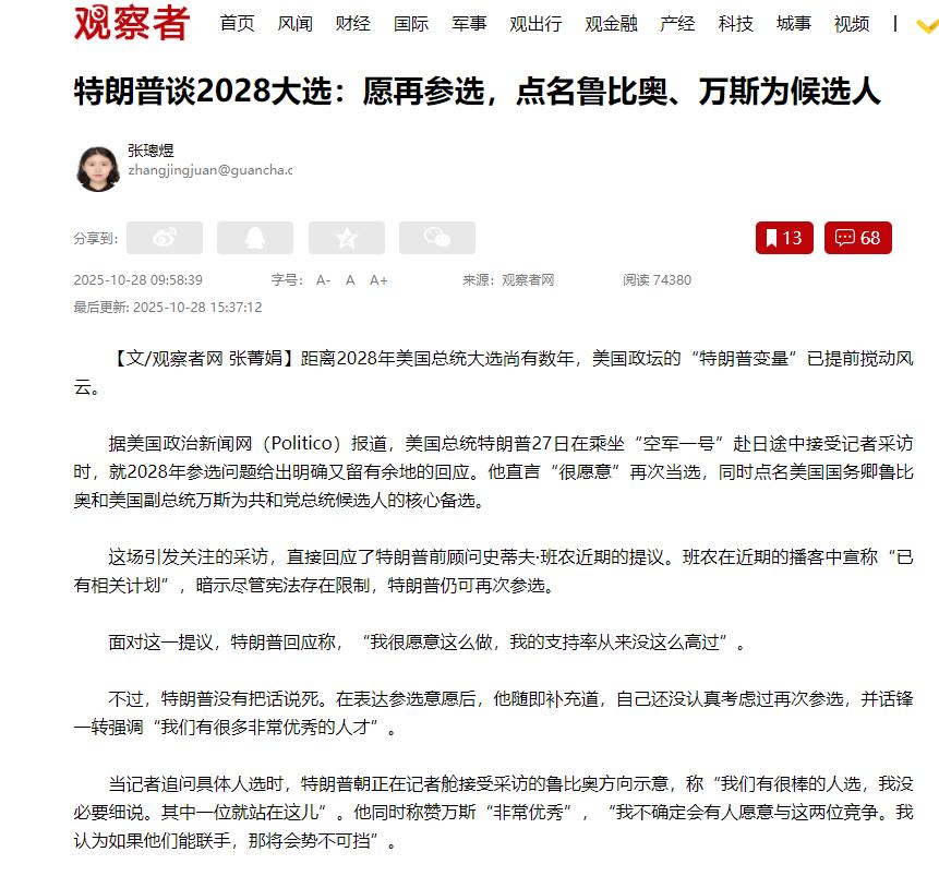 特朗普在前往日本的“空军一号”专机上向记者宣布,他不排除在2028年再次竞选总统的可能性,但考虑到第三次任期违宪,他认为该职位的主要竞争者是副总统万斯和国务卿鲁比奥。 先说说特朗普嘴里的“违宪”到底是啥规矩,这可不是他随便找的台阶,是写在美国宪法里的硬规矩。美国宪法第22修正案写得清清楚楚:“没人能通过选举当总统超过两次”。 这规矩的由来还跟罗斯福有关,当年罗斯福借着二战的特殊情况,一下当了四届总统,一直干到去世。二战结束后,美国朝野上下都怕总统权力太集中搞独裁,就特意在1951年通过了这条修正案,给总统任期套上了“紧箍咒”。 那特朗普自己的情况咋算呢?他2017年到2021年已经当了一任总统,2025年1月又刚开启第二任。要是2028年再参选,就算选上了,也是第三次通过选举当总统,正好撞在第22修正案的枪口上,根本行不通。 更有意思的是,之前还有人猜他会不会绕个弯子,去当副总统来曲线回归,结果他自己前不久就否认了,说“不会这么做”。其实就算他想,宪法第12修正案也把路堵死了——里面写着“不具备当总统资格的人,也不能当副总统”,他既然没资格当总统,自然也当不了副总统。 既然自己参选没戏,特朗普点出的这两个接班人就大有讲究,俩人的背景和路子完全不一样。先说说副总统万斯,这人的人生就跟从底层拼上来的励志故事似的。他1984年生在俄亥俄州的工人家庭,妈妈沾了毒瘾,爸妈早就离婚了,从小跟着外公外婆长大,高中的时候差点就辍学了。后来他去参军,还到伊拉克当战地记者,退役之后才考上俄亥俄州立大学,最后居然摸到了耶鲁法学院的门槛,这一路走得挺不容易。 2016年的时候,万斯写了本《乡下人的悲歌》,把锈带地区工人的贫困和难处写得特别真实,一下子就火了。不少人还借着这本书搞懂了“为啥特朗普能赢”,他也跟着成了工人阶级的“代言人”。 别看他2016年还骂特朗普是“白痴”,后来却彻底倒向了特朗普的MAGA阵营。2024年跟着特朗普竞选副总统,靠拉锈带地区的选票帮了大忙。2025年刚上任,就兼任了共和党财务主席,手里攥着钱袋子,权力不小。 他的政治主张跟特朗普贴得特别近:一边喊着要“清理中层官僚,换成自己人”,一边对援助乌克兰的事态度强硬,还骂拜登“用以色列孩子的事推销援乌政策”。这种“对内强硬改革、对外少给别人花钱”的路子,正好戳中了共和党基层选民的胃口。 再看国务卿鲁比奥,这人走的是“在全世界都要强硬”的路线,跟万斯那种盯着国内的风格完全不一样。早在2015年,他就参选过总统,当时就因为对俄罗斯态度强硬出了名。十年过去,反倒成了特朗普政府里的“外交操盘手”。今年2月,他还在沙特跟俄罗斯外长拉夫罗夫关起门聊了4个多小时,直接放话“美国能取消对俄的制裁”,这手笔可不小。 除了跟俄罗斯打交道,他还在推进一堆“不常见的外交事儿”:一会儿说要“接管巴拿马运河”,一会儿琢磨“收购格陵兰岛”,甚至还想插手加沙的事务,那点野心明眼人都看得出来。鲁比奥能被特朗普当成竞争对手,关键是他能平衡共和党内部的分歧,特朗普的MAGA基本盘喜欢他的本土政策,但党内的建制派和强硬派更看重美国在全球的霸权。鲁比奥正好能架起这座桥:既跟特朗普保持一致,又能稳住那些想让美国“继续当世界警察”的势力。 而且他在参议院混了好多年,人脉特别广。2024年帮特朗普协调国会选票的时候出了不少力,这种“能办事、有人脉”的特点,在党内初选里特别吃香。 其实特朗普这波表态,也是在给2028年共和党选总统定方向。他自己参选没戏,但作为党内的“老大”,点出这两个人选,既能保住自己的影响力,也能提前防止党内为了争候选人吵得不可开交。毕竟之前有民调显示,不少共和党选民想“要特朗普的政策,但不要特朗普本人”,万斯的“盯着国内改革”和鲁比奥的“对外强硬”,正好对上了党内两种主要的需求。 不过这俩人能不能笑到最后,也说不准。万斯虽然有特朗普撑腰,但他“工人代言人”的身份能不能一直圈粉,还得看2025到2028年他干得怎么样;鲁比奥搞外交要是出了岔子,比如跟俄罗斯接触让党内不满意,随时可能掉链子。 但不管咋说,特朗普这番话已经把2028年共和党选总统的路子说清楚了,不管最后是谁上,大概率还是走他铺的路,只不过换了个人来操办而已。