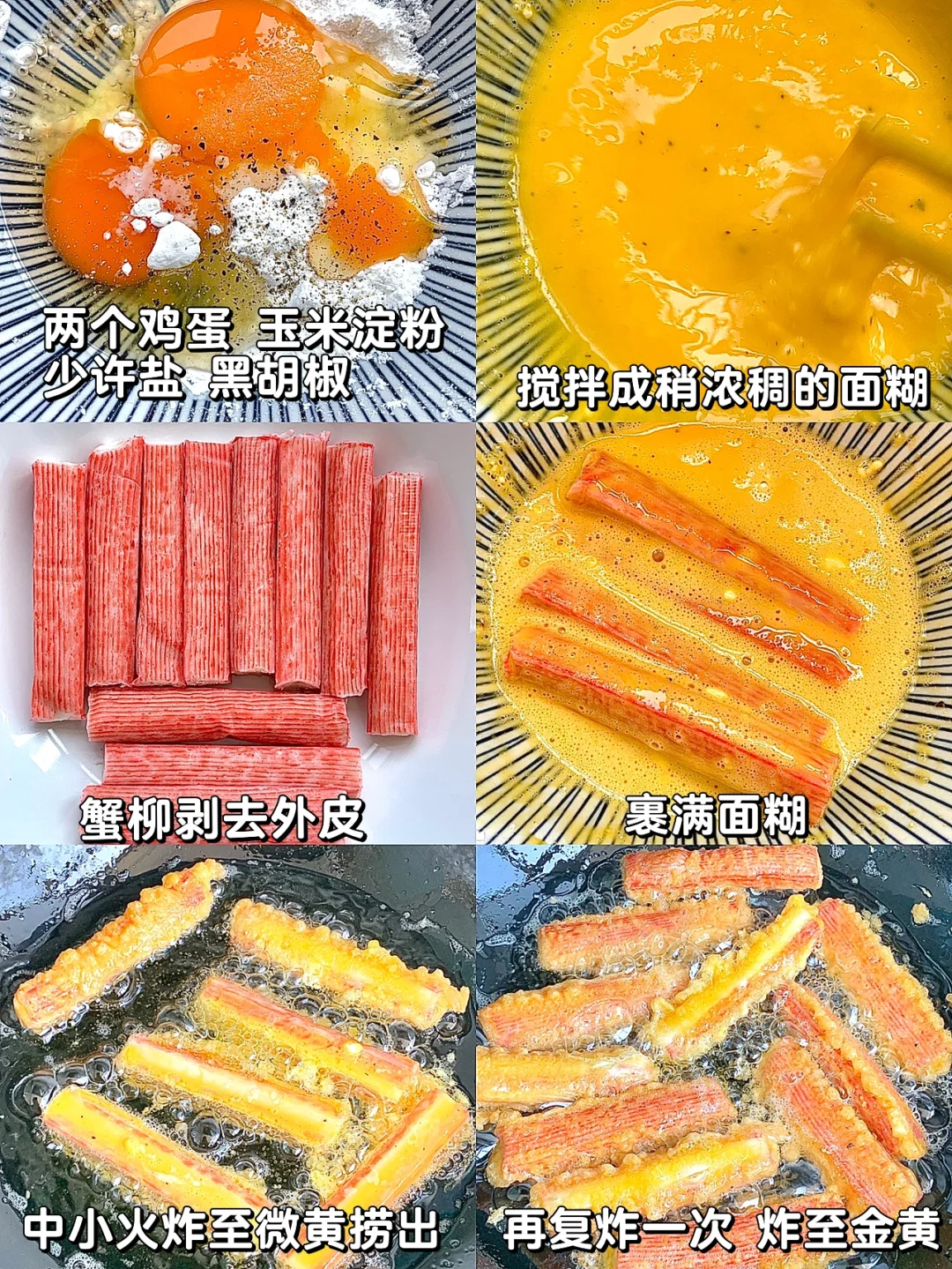 外酥内嫩!!炸蟹柳!超级快手!一定要试试! - 🌟🌟食材: 蟹柳、玉米淀粉、两个鸡蛋、盐、黑胡椒 🌟🌟步骤: 1⃣️两个鸡蛋,加入玉米淀粉、一小勺盐、少许黑胡椒拌匀,搅拌成稍浓稠的面糊 2⃣️蟹棒剥去外皮,均匀裹上面糊 3⃣️锅中倒油(稍微多一点),中小火放入蟹棒,炸至微黄捞出 4⃣️最后再复制一次,炸至金黄捞出✅ - 外酥内嫩的口感太绝了!一根一根停不下来!!