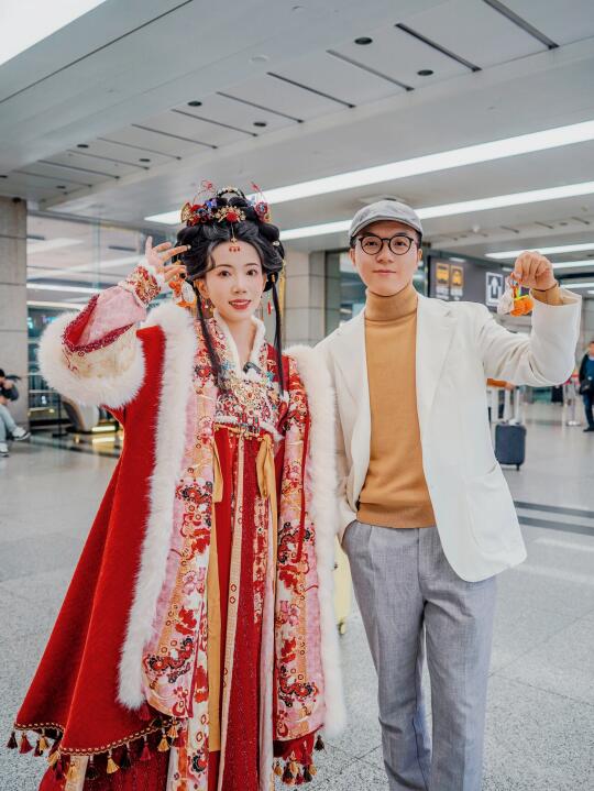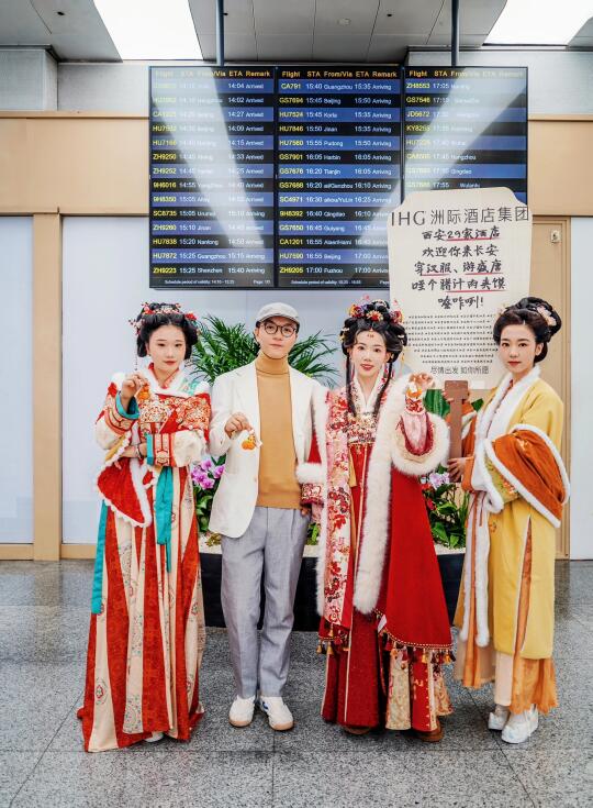 和一群身着美丽的汉服手举接机牌的小姐姐