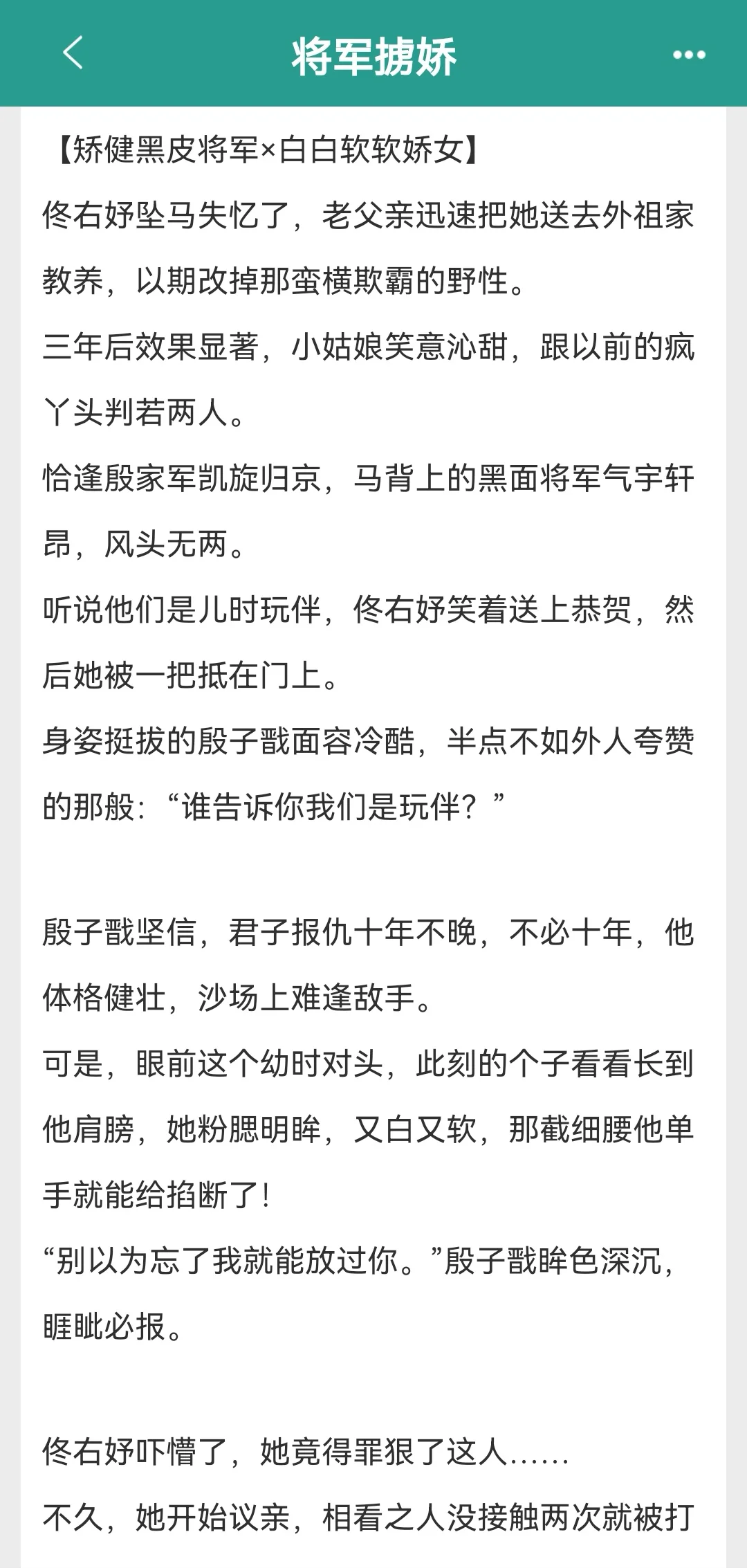 古言甜宠文一大波向你袭来! 强推《将军掳娇》! 体型差,肤色差,超级好磕啊啊啊啊啊! 这个作者超级会写小可爱女主,白白软软糯糯,可爱死了!男主表面上要强迫人家实际上宠的不行!