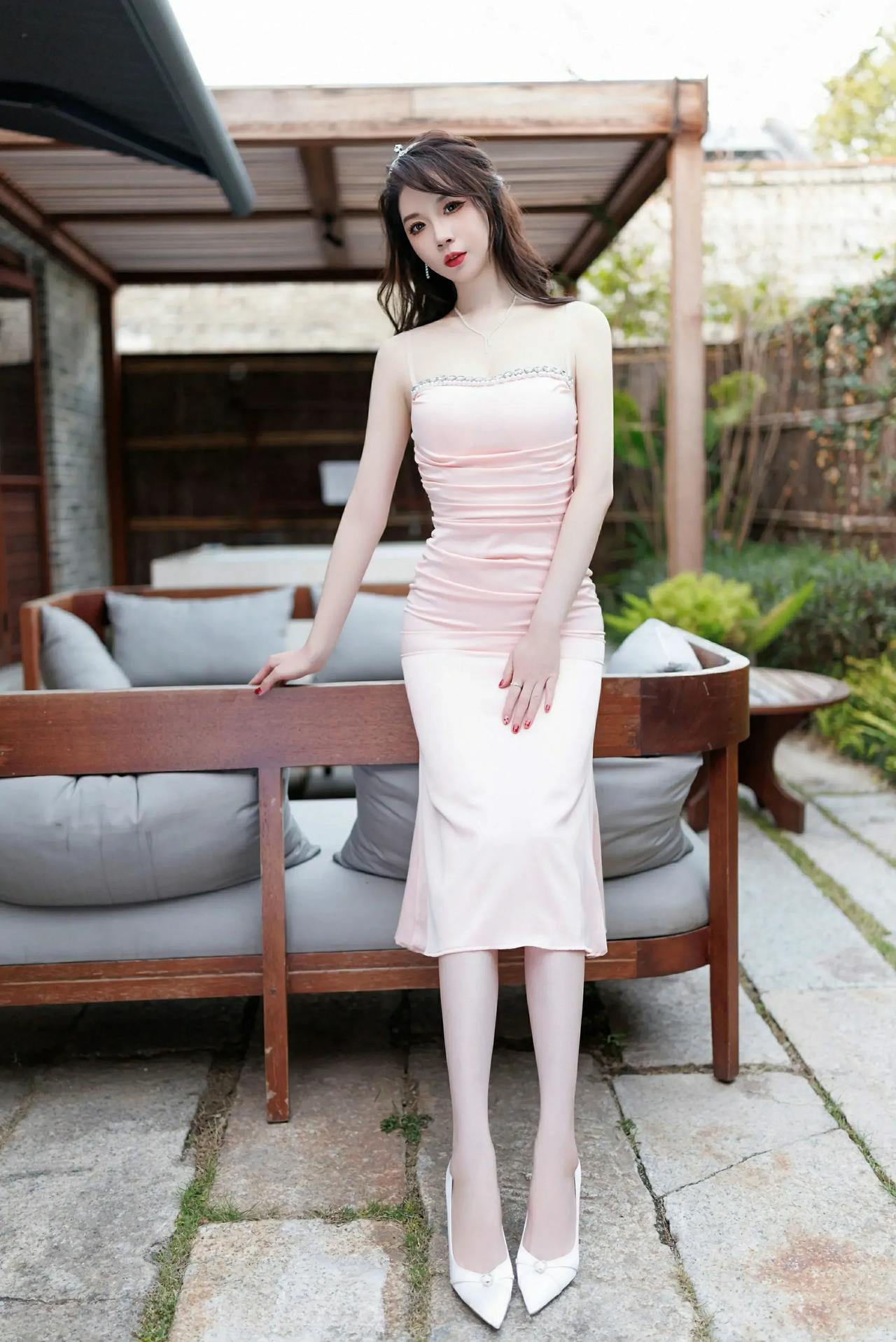 模特梦心玥粉色连衣长裙露红色内衣配白丝袜秀高挑身材