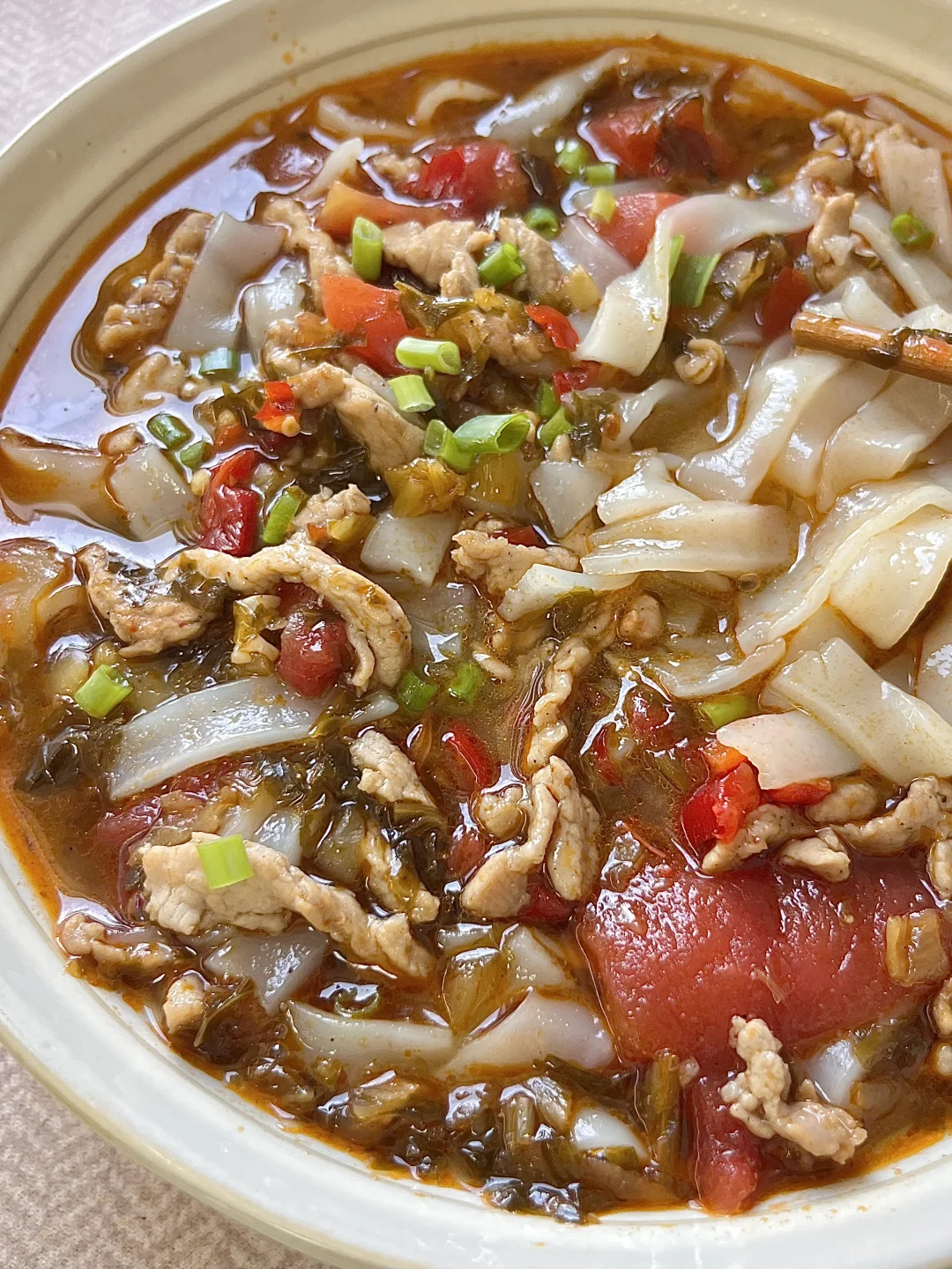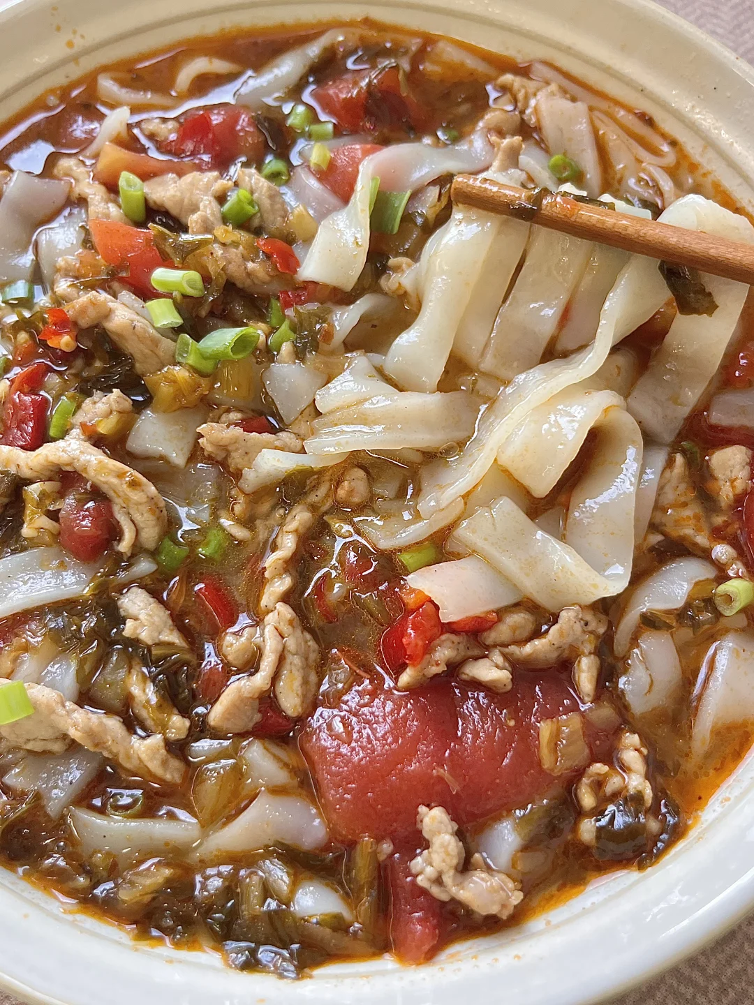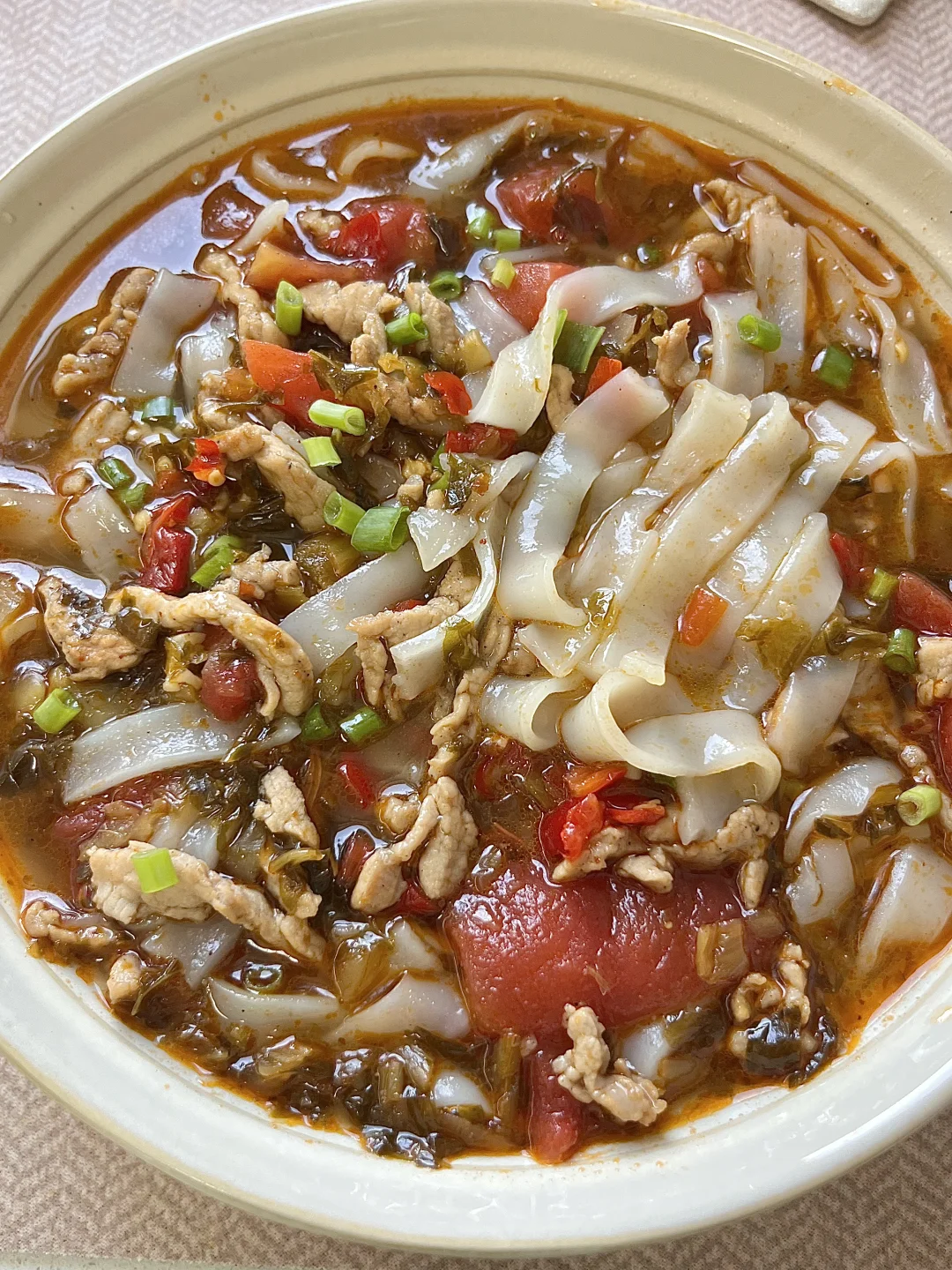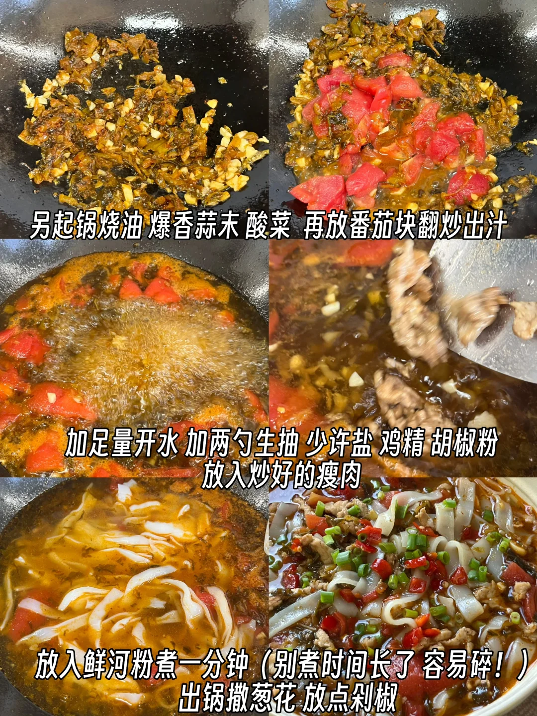 附做法: 1️⃣猪瘦肉切丝,放一勺生抽、一勺蚝油、少许胡椒粉、淀粉、食用油抓匀,腌制十五分钟 2️⃣番茄切块备用;起锅烧油,瘦肉炒熟盛出备用 3️⃣另起锅烧油,爆香蒜末、酸菜,放番茄块翻炒出汁,加足量开水,加两勺生抽、少许盐、鸡精、胡椒粉 4️⃣再放入瘦肉、放鲜河粉(煮一分钟就行了,不然容易碎),出锅撒葱花、放点剁椒✅ -