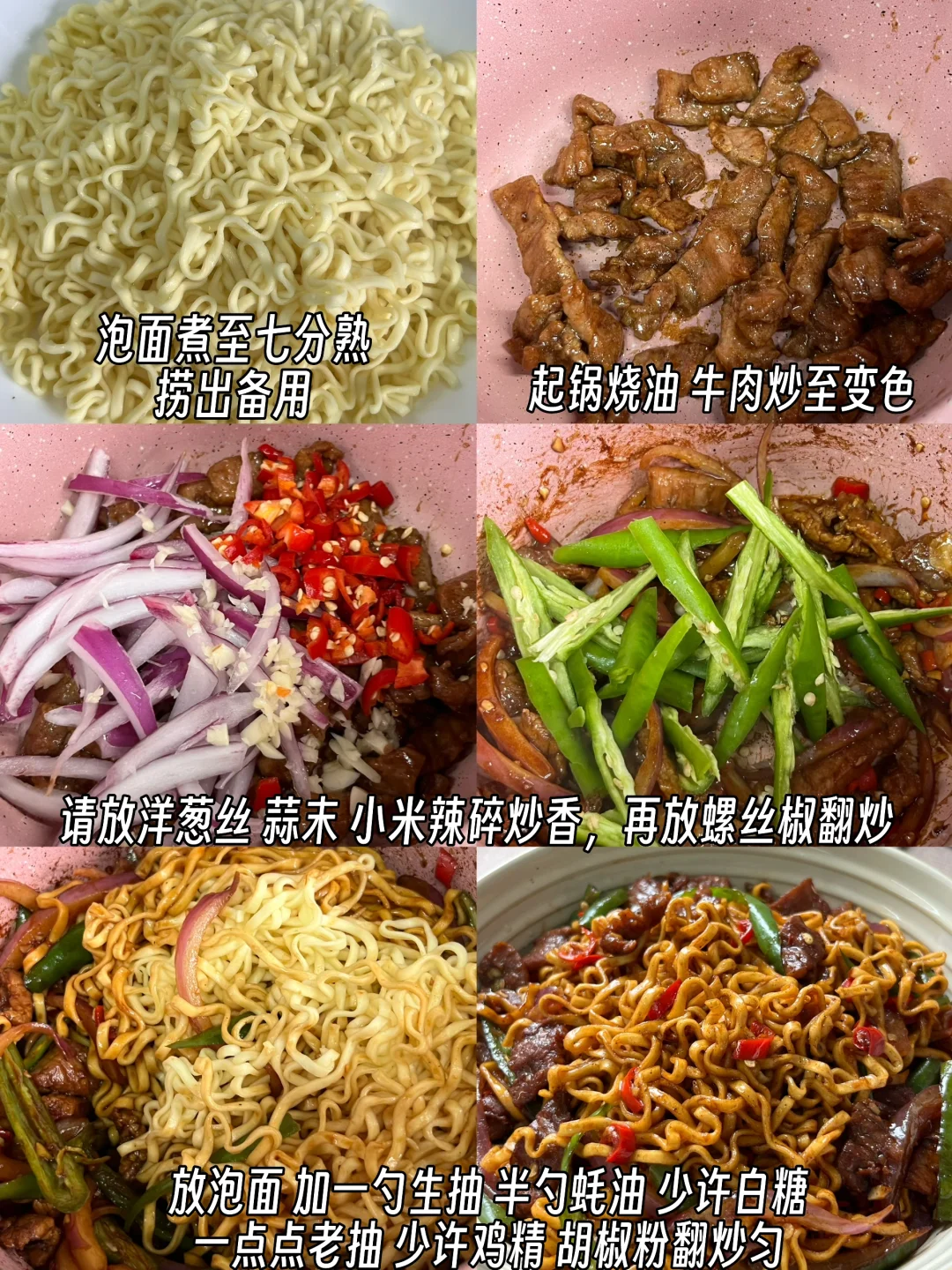 附做法: 1️⃣牛肉切薄片,放两勺生抽、一勺蚝油、少许胡椒粉、少许淀粉抓拌均匀,喷一层油腌制十五分钟 2️⃣泡面煮七分熟捞出备用;起锅烧油,牛肉炒至变色,加洋葱丝、小米辣碎、蒜末炒香,再放螺丝椒翻炒 3️⃣放入泡面,加一勺生抽、半勺蚝油、一点点老抽、少许白糖、少许鸡精、胡椒粉翻炒均匀✅ -