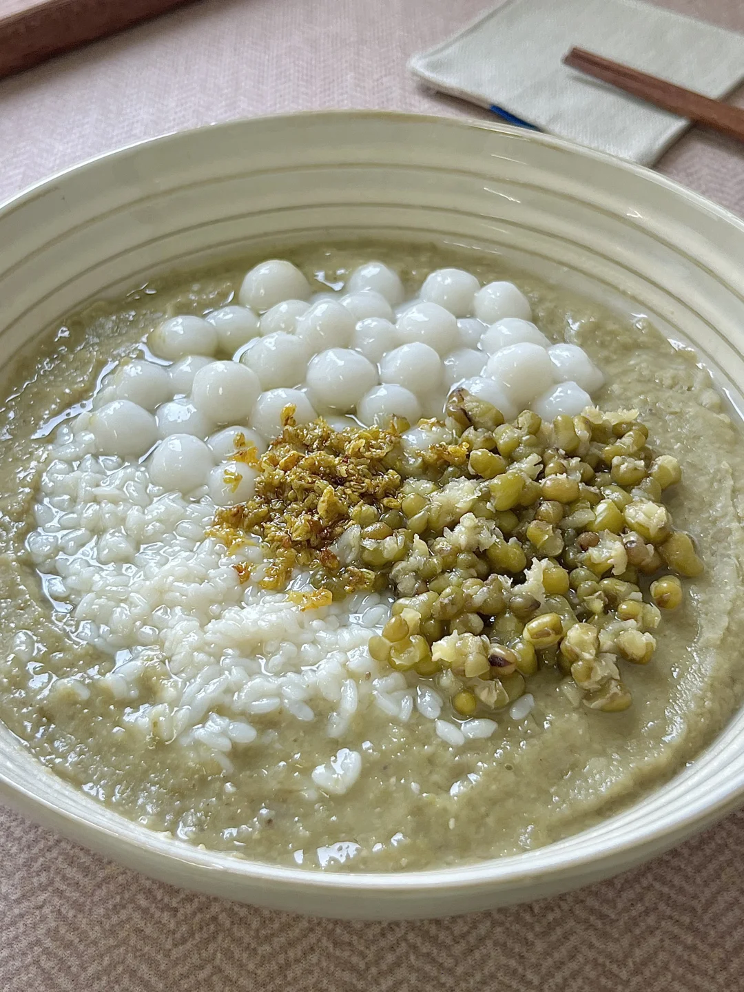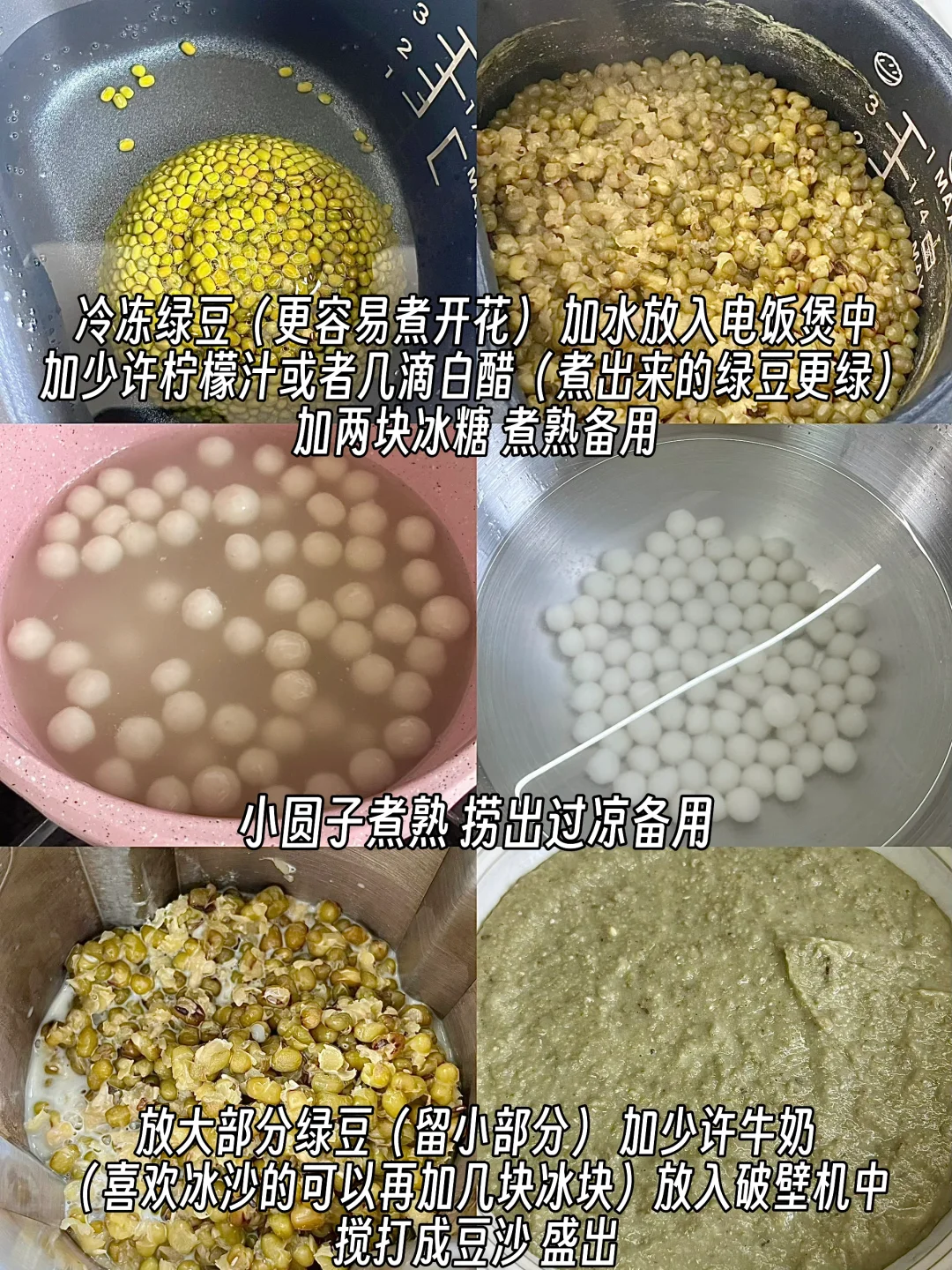 附做法: 1️⃣(加水冷冻后的绿豆更容易开花),冷冻绿豆加水放电饭煲里,加几块冰糖、少许柠檬汁或者几滴白醋(煮出来更绿) 2️⃣小圆子煮熟捞出,过凉备用;大部分绿豆放入破壁机中(留小部分),加少许牛奶(喜欢冰沙口感的加几个冰块)一起打碎成豆沙 3️⃣豆沙盛到碗中,放小圆子、酒酿、绿豆,淋少许桂花蜜✅ -