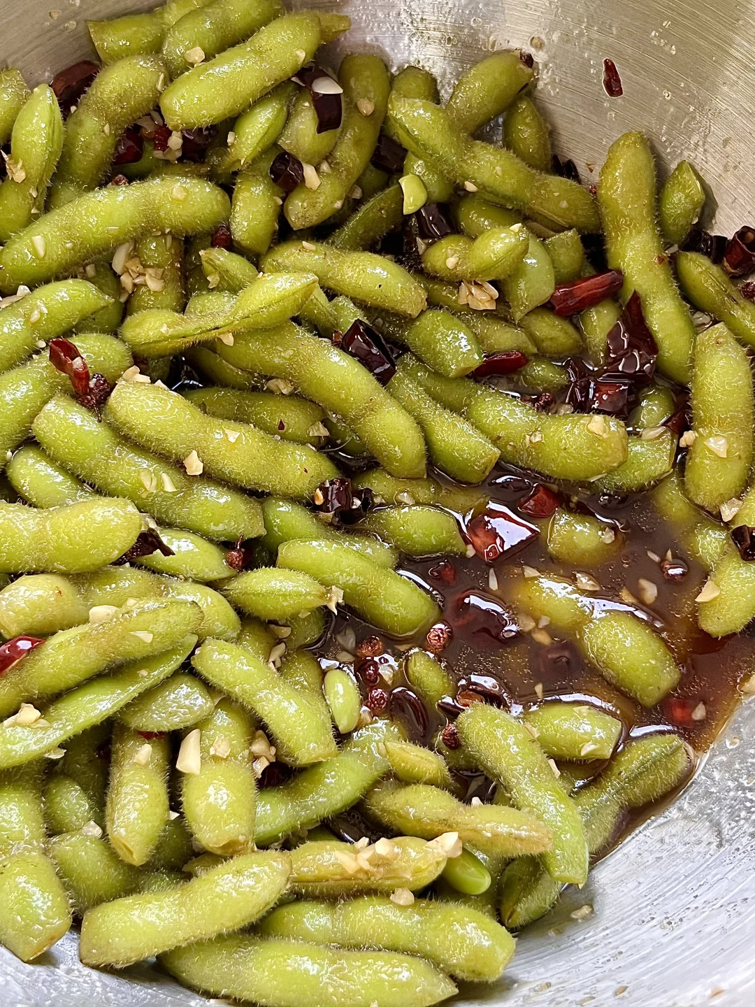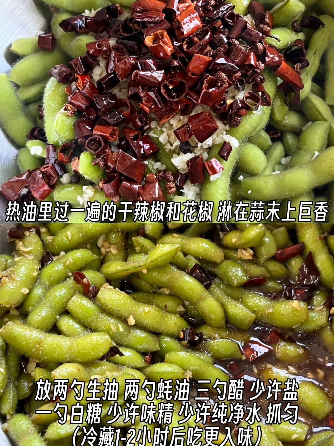 附做法: 1️⃣毛豆多洗几遍,洗干净后用剪刀剪去两头;锅中烧水,放适量盐、八角、花椒,煮开后下毛豆,煮6-7分钟 2️⃣毛豆捞出后沥干水分,上面放大量蒜末 3️⃣锅中稍微多放点油,油烧热,到冒烟关火,放一把花椒、一把干辣椒段,淋在蒜末上 4️⃣放两勺生抽、两勺蚝油、三勺醋、一勺白糖、少许盐、少许味精、少许纯净水抓匀✅ (放冰箱冷藏1-2小时更入味) -