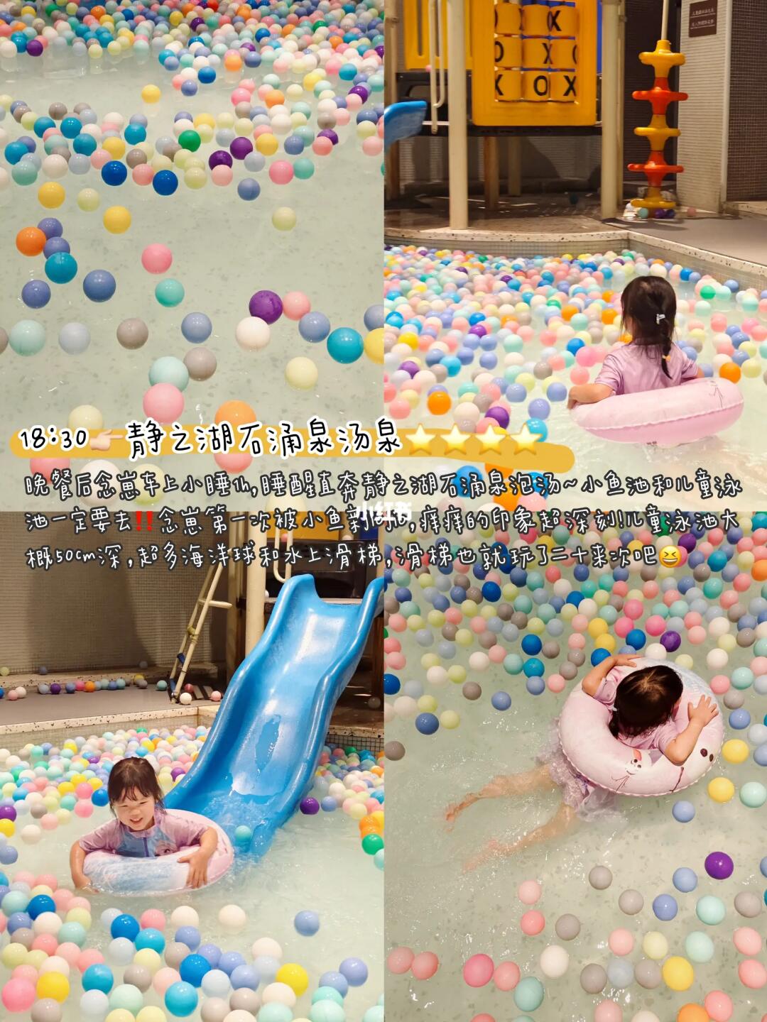 晚餐后念崽车上小睡1h,睡醒直奔静之湖石涌泉泡汤~小鱼池和儿童泳池一定要去‼️念崽第一次被小鱼亲jiojio,痒痒的印象超深刻!儿童泳池大概50cm深,超多海洋球和水上滑梯,滑梯也就玩了二十来次吧😆桑拿区也有儿童玩乐设施,好适合遛娃!