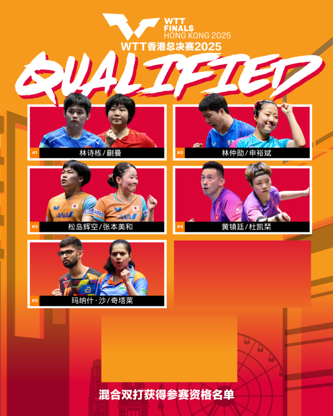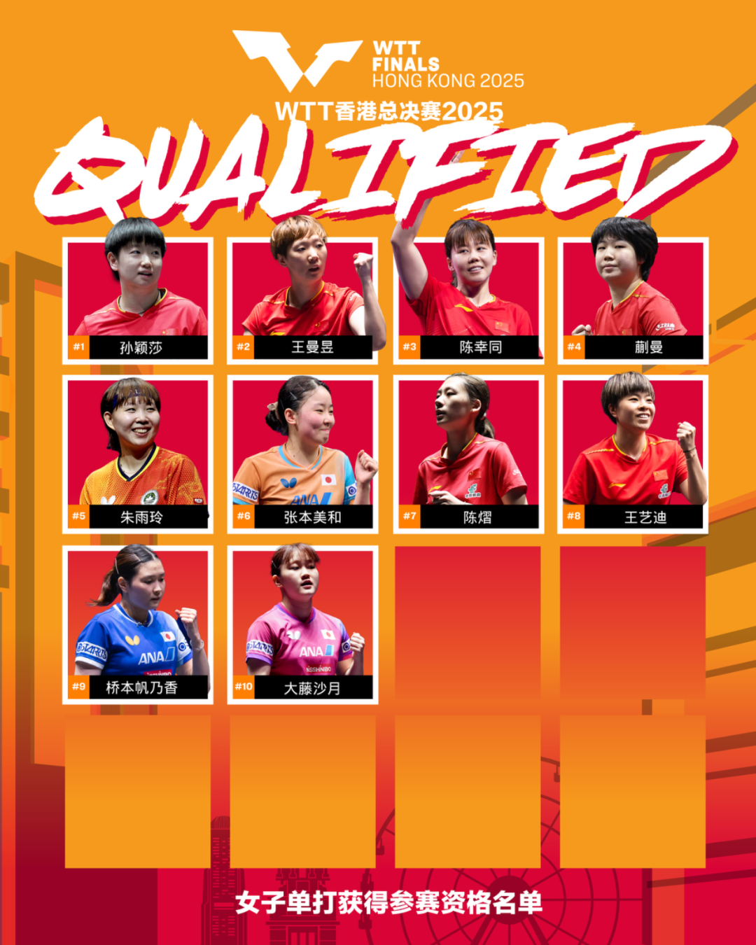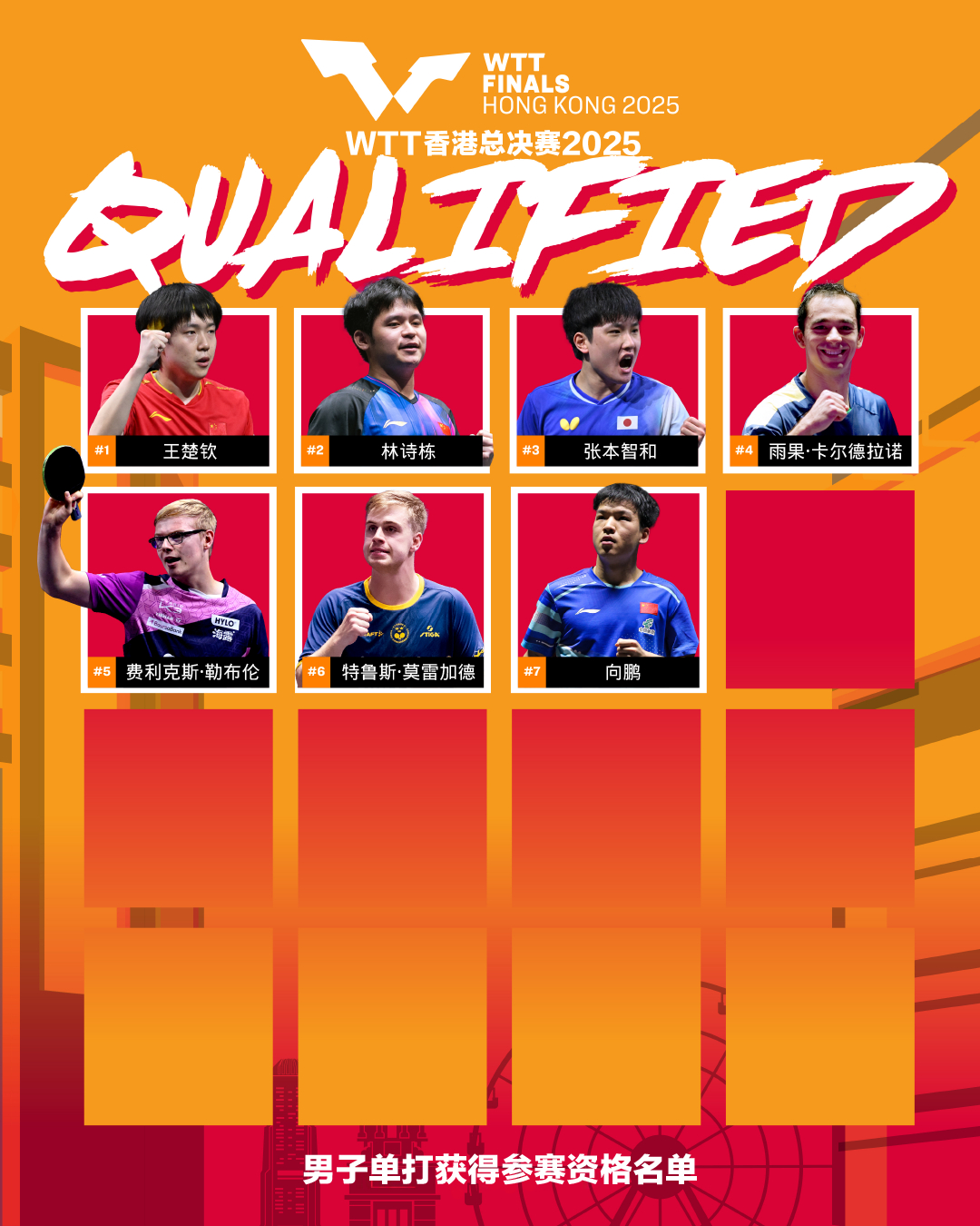 WTT香港总决赛2025将于12月10日至14日,在中国香港红磡体育馆举行。作为赛季收官战,WTT香港总决赛2025由WTT总决赛积分榜决定参赛资格。男子及女子单打阵容将由WTT总决赛积分榜排名前16的球员构成。混双的8对参赛组合,则由WTT总决赛积分榜排名前7的组合外加一对东道主外卡组合构成。