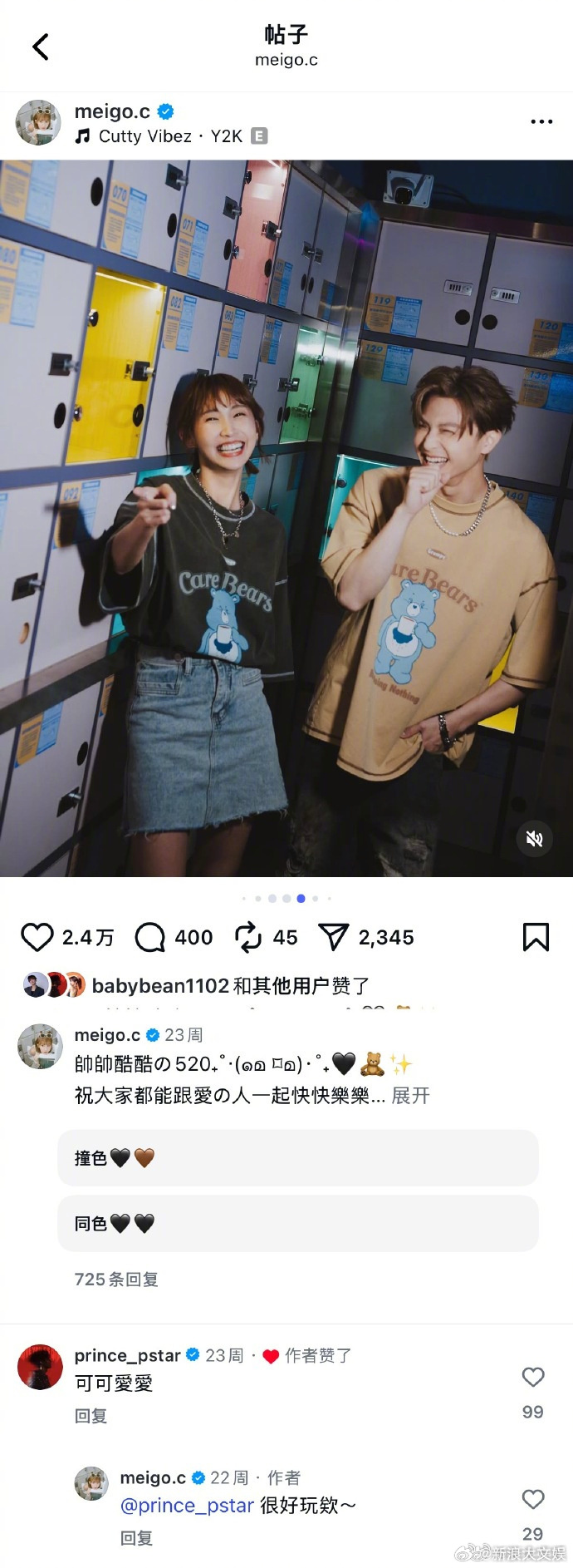 王子粿粿评论互动 王子粿粿早前互动评论被网友扒出,引发热议。此前,王子曾发布一条以《Desce Pro Play (PA PA PA)》为背景音乐的滑雪视频,粿粿在评论区留言“Papapa”,王子则回复:“对啪啪啪情有独钟?”王子还在粿粿发布含王子的多人合照评论区里留言:“可可爱爱”。