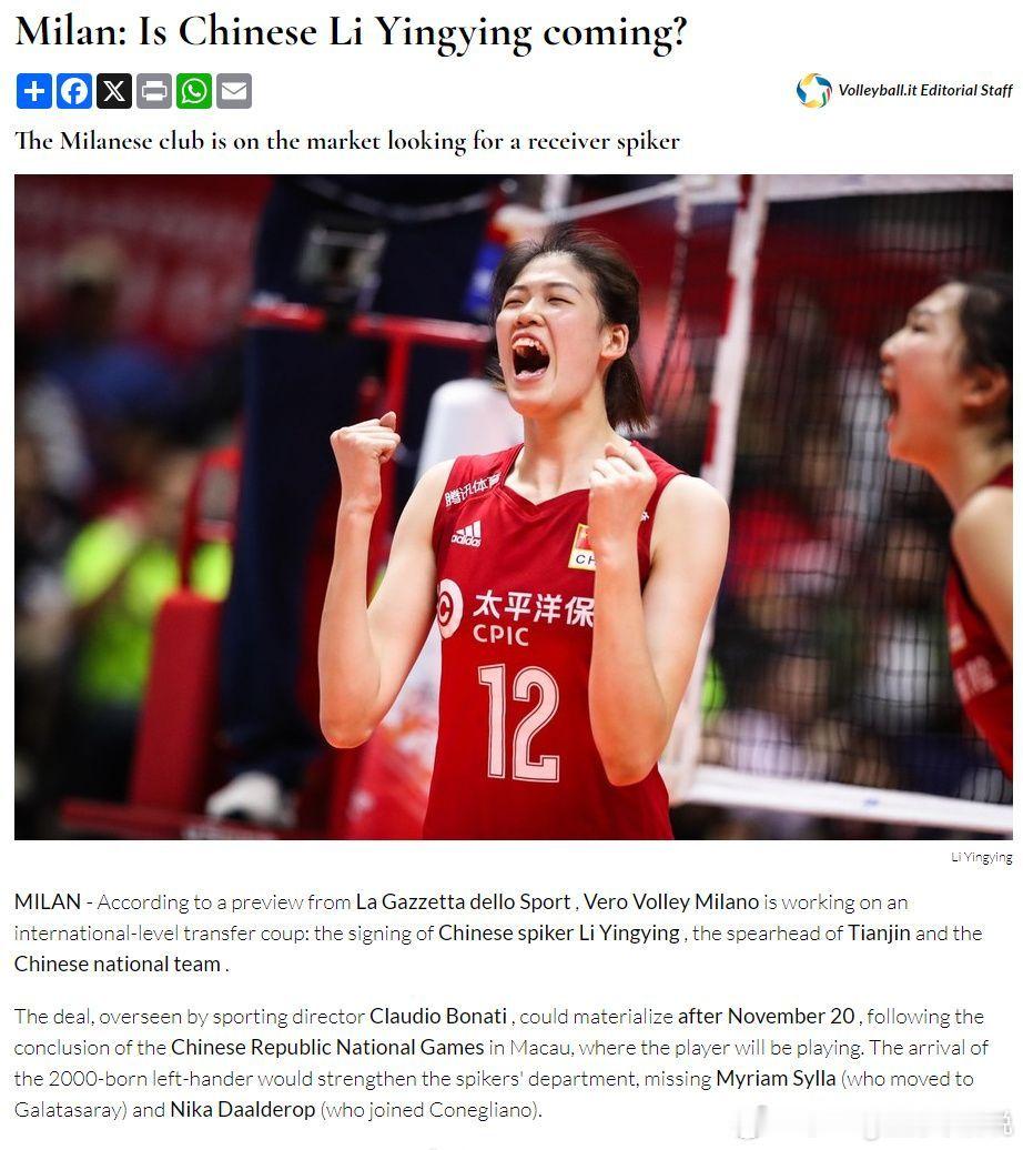 意大利媒体援引《米兰体育报》的报道,意甲的米兰女排正在运作李盈莹的转会。米兰体育总监博纳迪负责此项转会,预计会在11月20日全运会结束后出结果。与此同时,普拉克将离队转会至印尼。