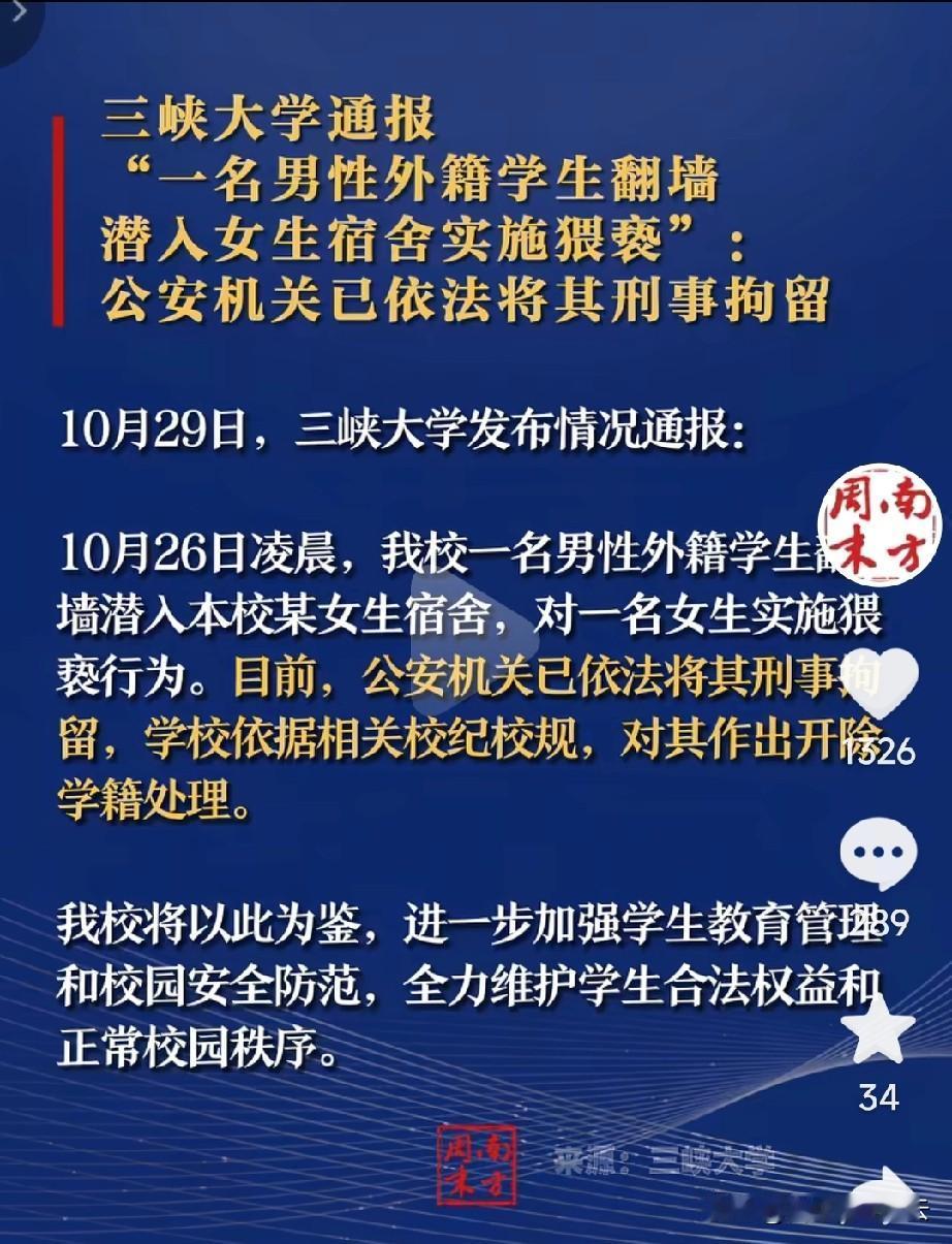 三峡大学爬进女生宿舍猥亵的外籍留学生是黑人,他们留学生的公寓与女生宿舍相对而立,中间隔着一条马路。 知情人爆料,这个留学生翻墙过去后,从女生宿舍一楼爬到二楼,他在猥亵女生时,女生奋力反抗,两人发生了激烈的搏斗。住在一楼的女生都听到了。 后来看到那个被猥亵的女生从宿舍逃了出来,脸上还带着伤,她跑到宿管阿姨那里去了,宿管阿姨拿着手电筒还找了,后来就报警了。 话说这个留学生也太大胆了,就算熄灯了,宿舍的女生还说很多的。他怎么敢这么张狂的?就不怕被抓吗? 有女生还说,她们宿舍以前经常丢内衣内裤,现在想来也细极思恐。 现在留学生已经被刑事拘留,学校也开除了他的学籍。学校还派人给女生宿舍外面加装了铁丝防护网。 但是三峡大学的评论区已经不能评论了,这是怎么回事呢? 对于这件事,你怎么看呢?