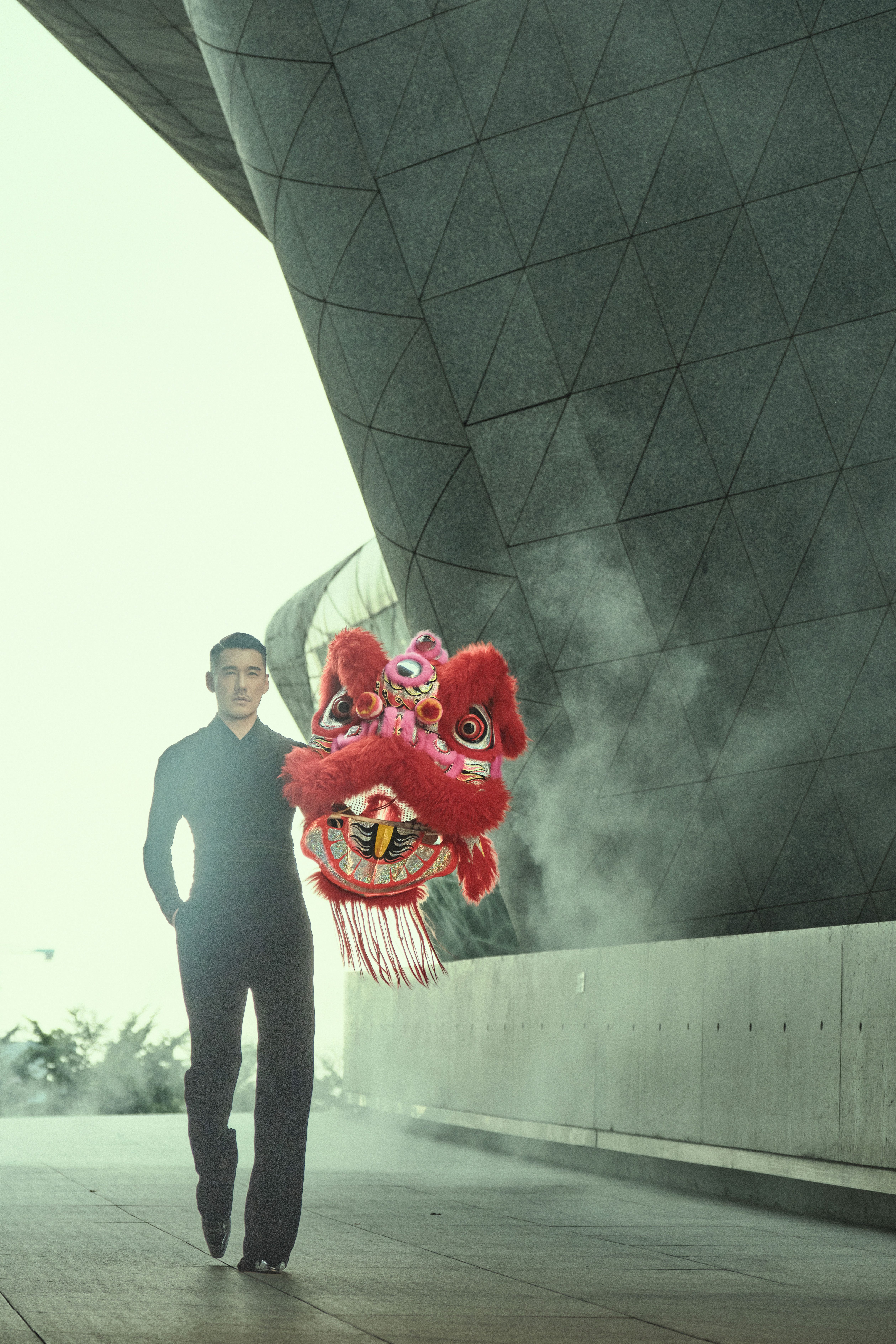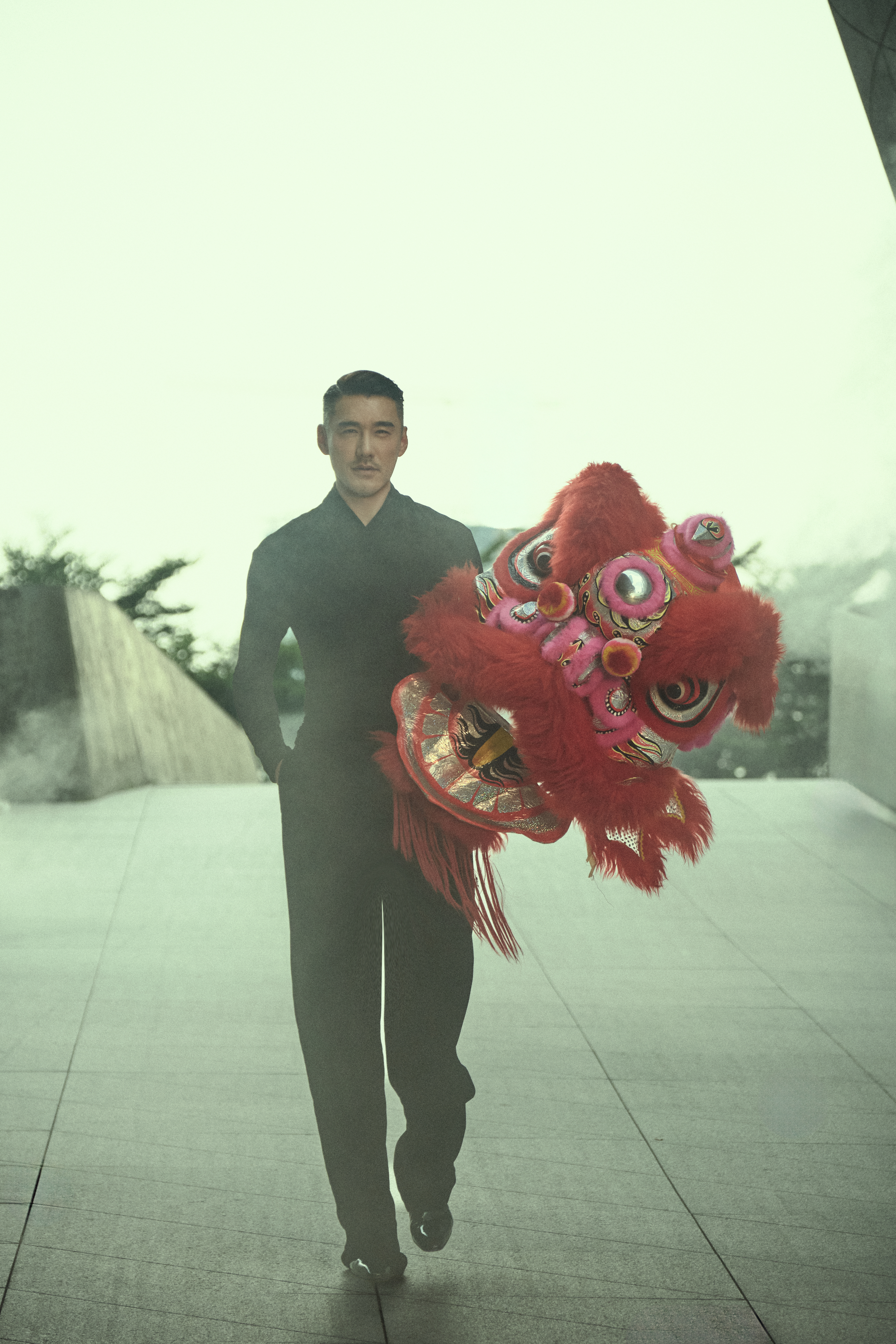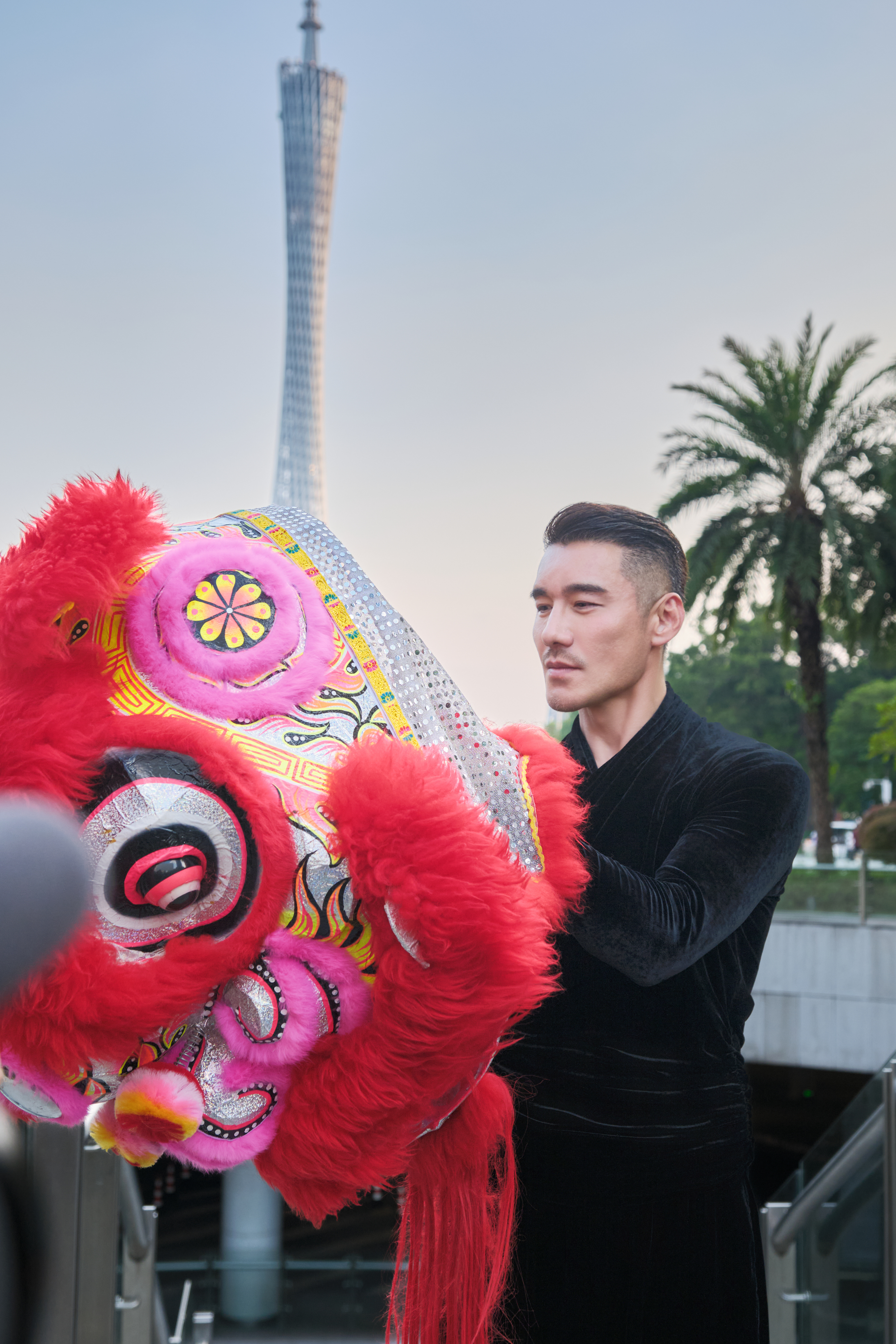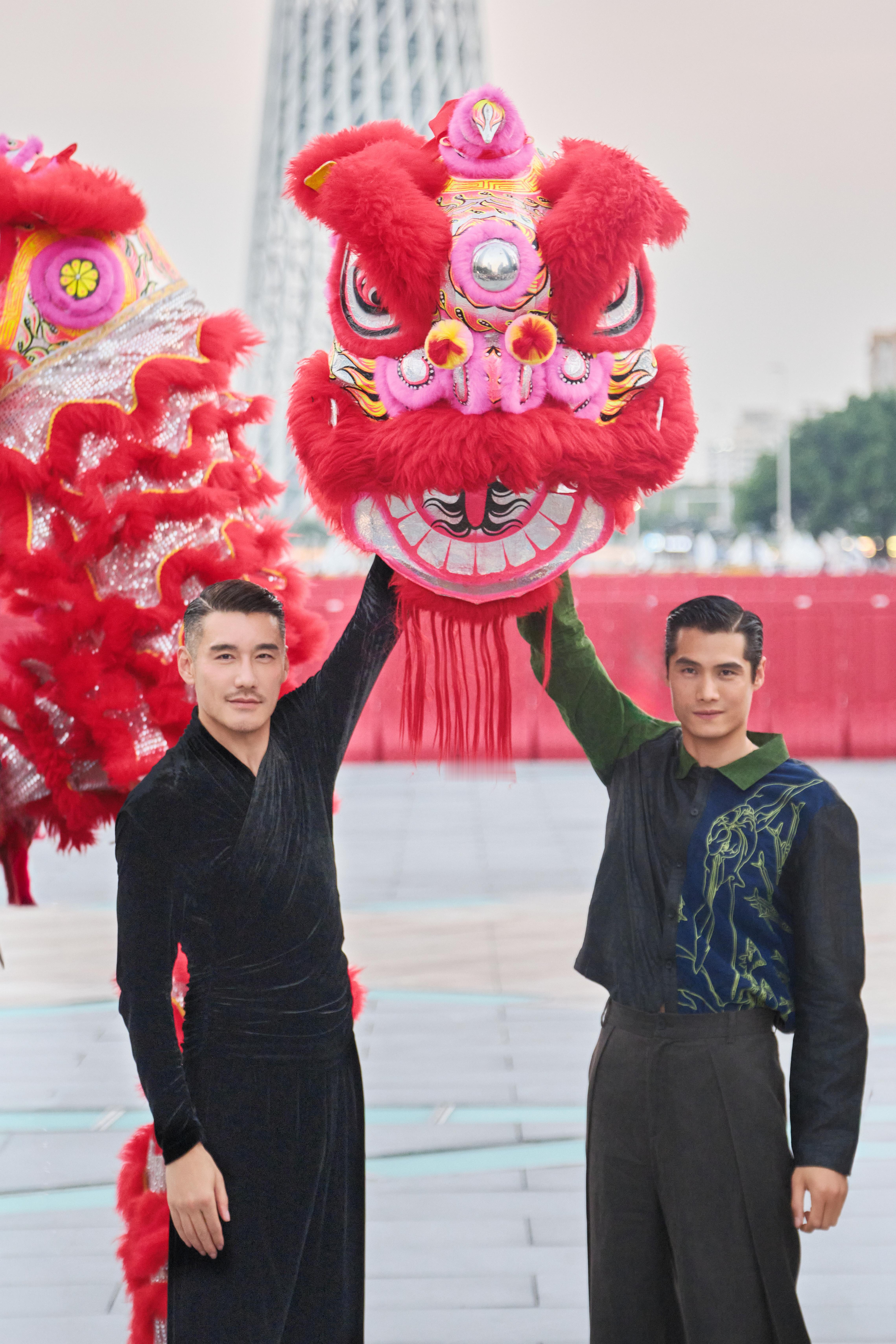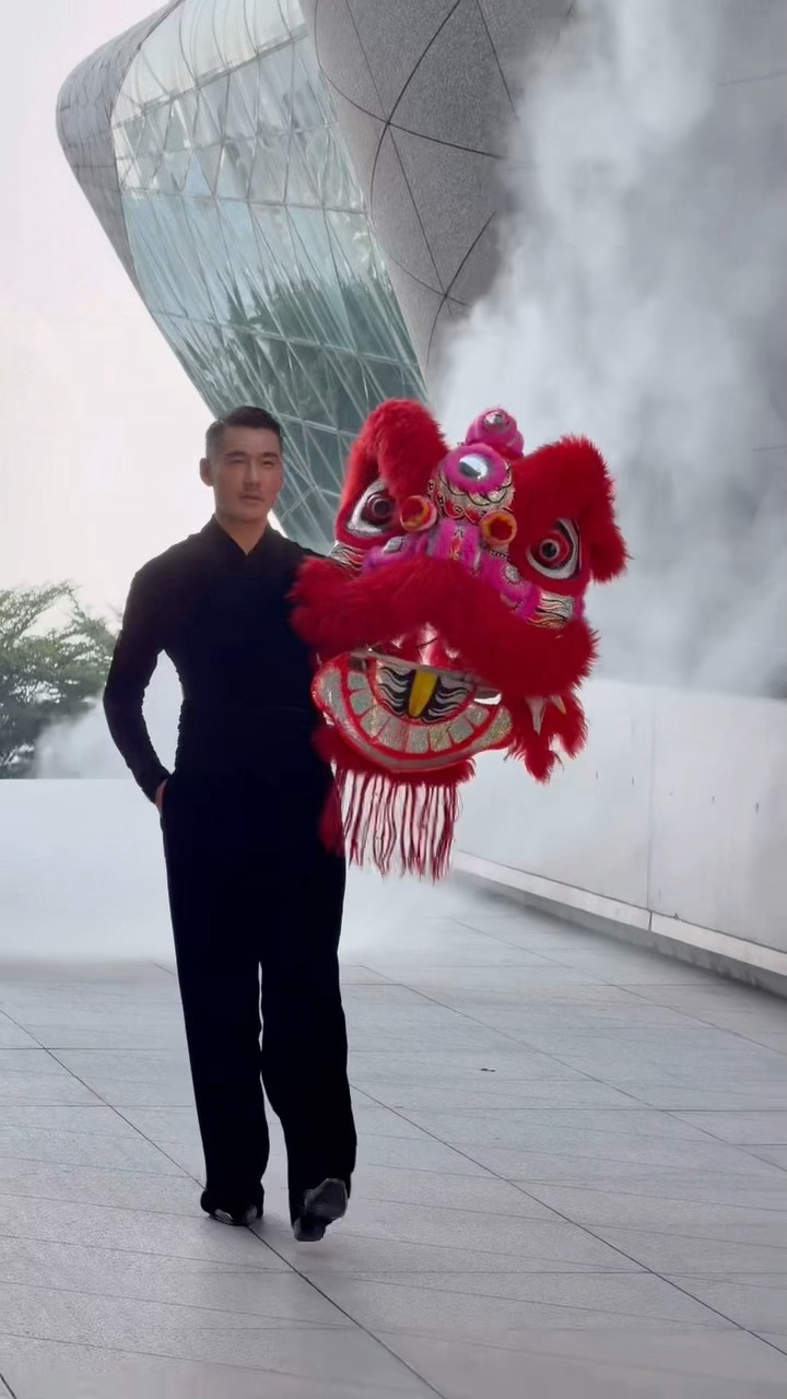他戴着醒狮头昂首走来,一步一脚印都踩着时尚节奏,却把非遗文化的厚重感稳稳接住了。那种走路带风的气场,瞬间把“文化自信”写在了每个镜头里。