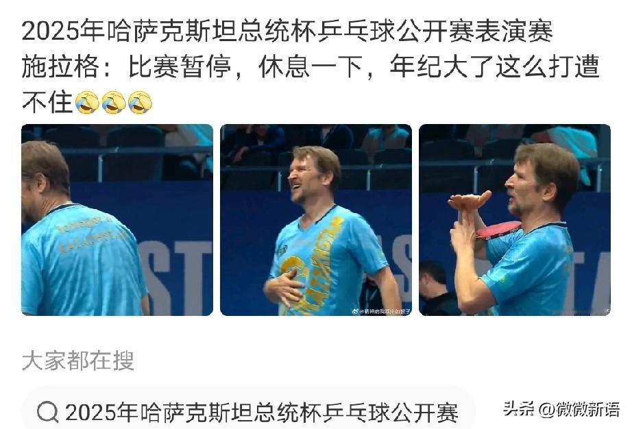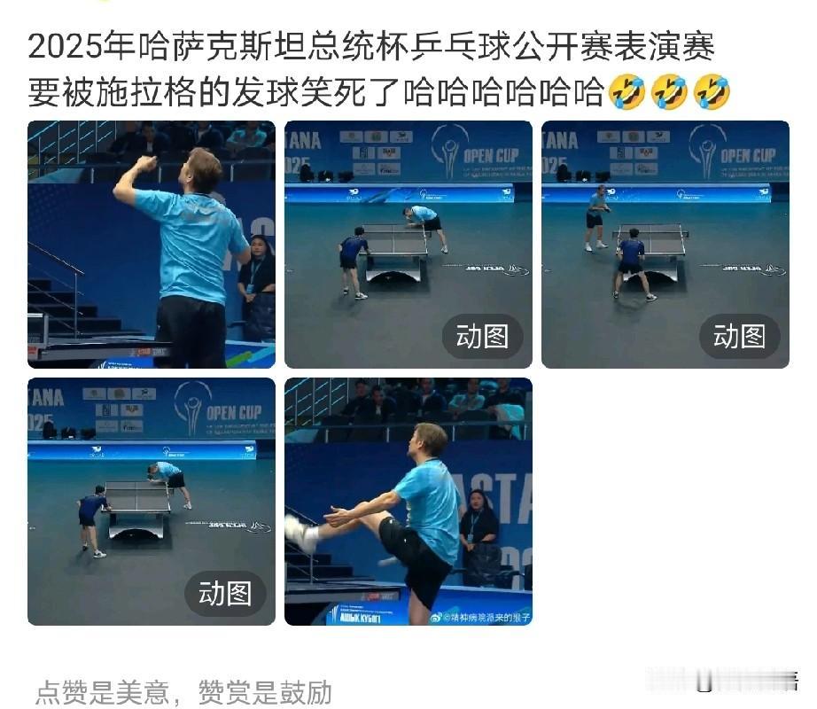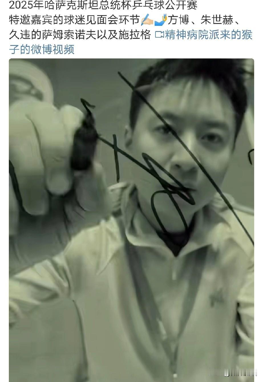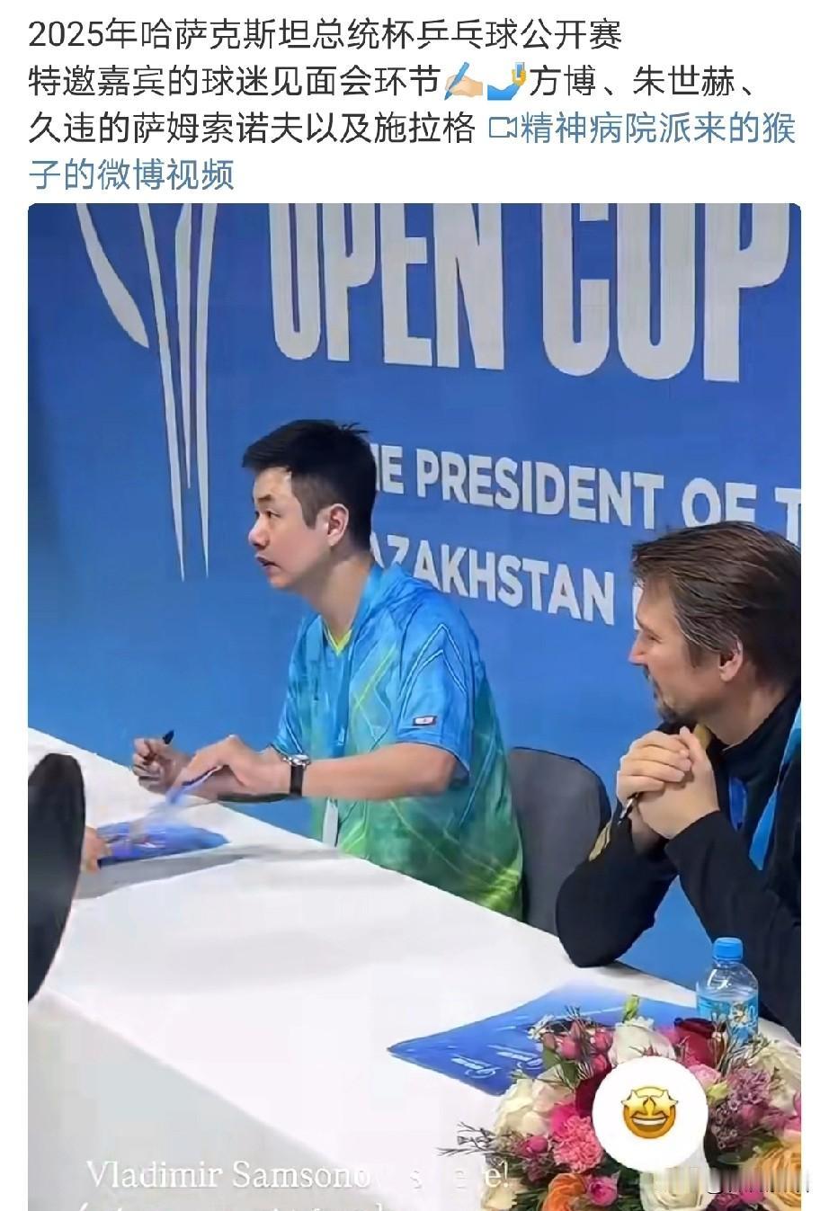 许昕穿着红色比赛服上场了。 2025年哈萨克斯坦总统杯乒乓球公开赛,许昕、方博、朱世赫、施拉格出席了见面会,后面还有表演赛,看看看许昕和朱世赫的表演赛,一上来许昕就上强度了,得亏场地大,要不然昕哥得跑到场外去,许昕打比赛就得场地大点,才能发挥的好,许昕的远台对拉确实厉害。昨天还在看许昕发抖音在打网球,今天就去了哈萨克斯坦。 看到方博也去了,当地也有很多的小球迷来到现场找他们签名。刚刚看施拉格的比赛,他叫了暂停说:比赛暂停,休息一下,年纪大了这么打扛不住。确实施拉格已经53岁了,确实体力有点跟不上,不过这是表演赛,大家快乐乒乓。 后面看了他们剪辑出来施拉格的发球,真的是比许昕还全面啊,有球迷说:“我记得施拉格在09年亚欧对抗赛也发过这个球。”看来这个是老球迷了,很早之前就一直在看乒乓球的比赛。看到今天现场的观众也很多,国外很喜欢许昕这种比较秀,观赏性高的打法。