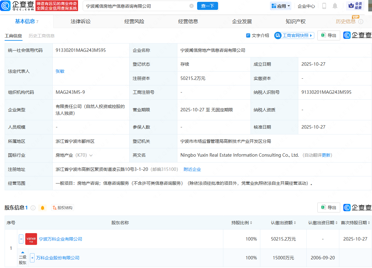 企查查APP显示,近日,宁波禹信房地产信息咨询有限公司成立,法定代表人为张敏,注册资本约为5亿元,经营范围包含:房地产咨询;信息咨询服务。企查查股权穿透显示,该公司由万科A(000002)间接全资持股。