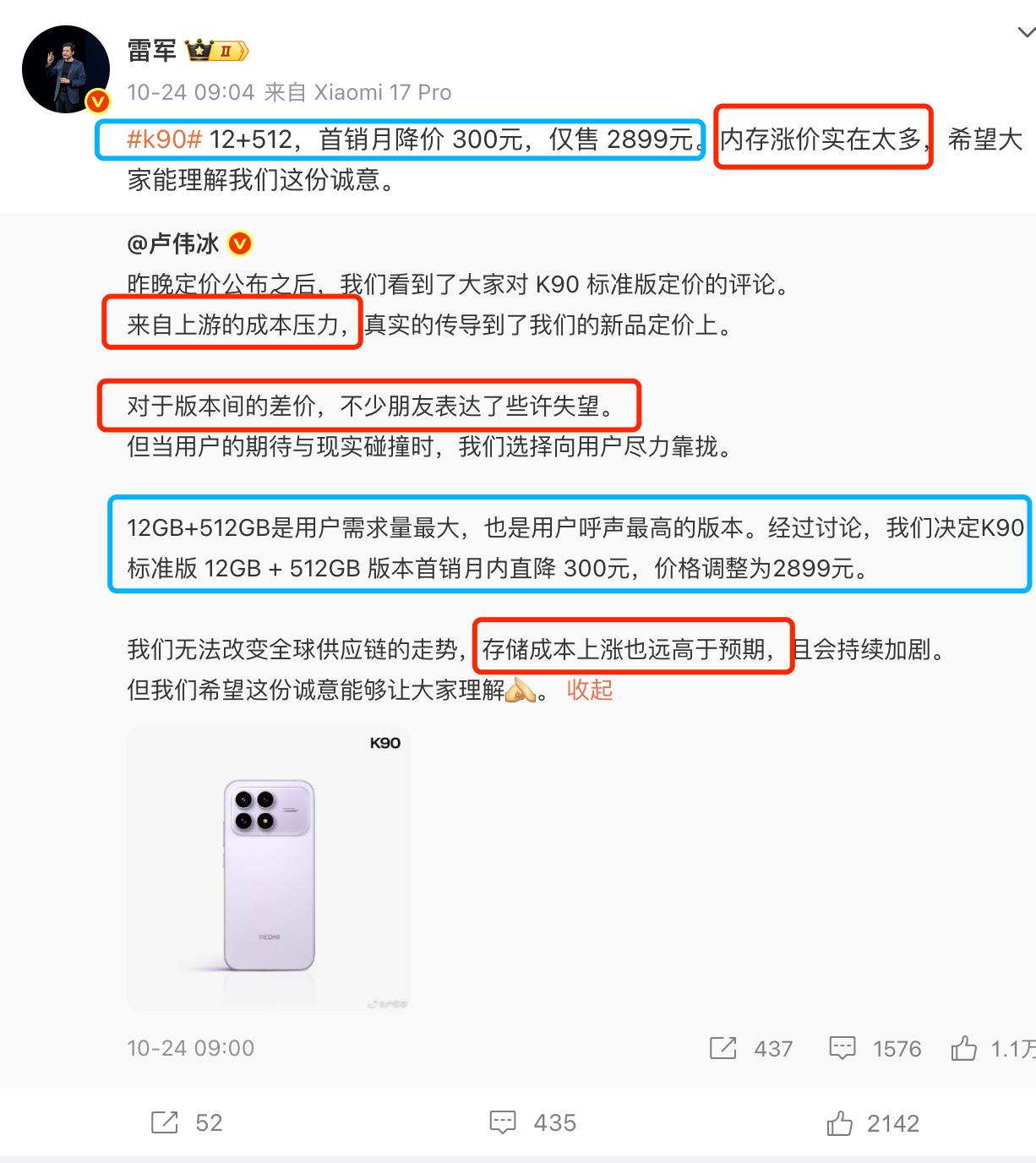 有点意外,REDMI K90系列销量扑街了,甚至连K80系列都没打过。 K90系列首销的数据跟K80系列差不多持平,超过了13万。 但是三日数据才接近25万(相当于后面两天才销售了12万,平均一天6万,销量差不多腰斩了),同比K80系列,只有80%的数据。 个人分析有以下两个原因: 标准版K90被很多人说诚意不足,在价格上调100元的前提下,屏幕从2K变成了1.5K,并且越往后大运存大存储版本的价格就越贵。所以卢伟冰跟雷军赶紧在微博上感觉说最近存储价格上涨,有成本压力,所以把12+512G降价了300元,从3199调整为2899,跟16+256G一个价了。 那么我们看看K80和K90的版本差价有多少: K80 12+256GB:2499 16+256GB:2699 12+512GB:2899 16+512GB:3199 16GB+1TB:3599 K90: 12+256GB:2599(差价100) 16+256GB:2899(差价200) 12+512GB:原定3199,首销月降价至2899(优惠后无差价,恢复价格后差价300) 16+512GB:3499(差价300) 16GB+1TB:3999(差价400) 所以我们可以看到,越往后版本之间的差价就越大,难怪K90发布后大家不买账。按道理K80很多人吐槽外观不好看,这次K90改变挺大的应该有所提升才对,但现在看来并不是这么一回事。 至于K90ProMax,虽然也涨价挺多,但是配置上提升也挺大,现在就看后面REDMI能否撑起这3999起的售价了。要是后续这产品口碑跟不上,那K90系列就算是彻底崩了,只有降价一条路。