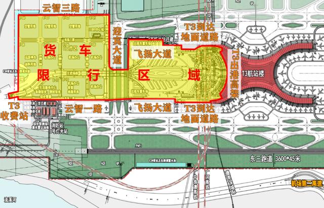 机场第二高速T3收费站、飞扬大道、T3到达地面道路及T3出港高架之间区域(含飞扬大道东往北匝道、北往西匝道和云智一路隧道路段)。