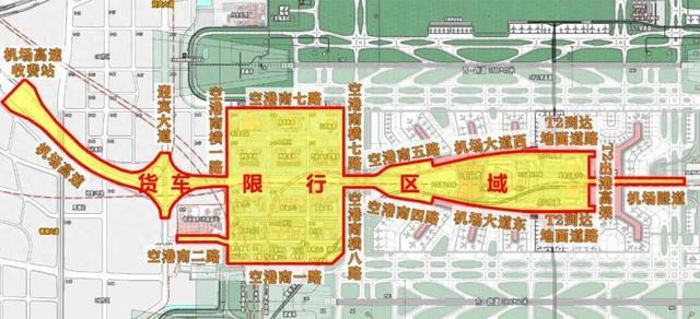 机场高速机场收费站以北道路(含机场高速匝道)、机场大道南、空港南四路(空港南横八路-P1停车场)、空港南五路(空港南横七路-P5停车场)、机场大道东、机场大道西、T2到达地面道路、T2出港高架及机场隧道之间区域。