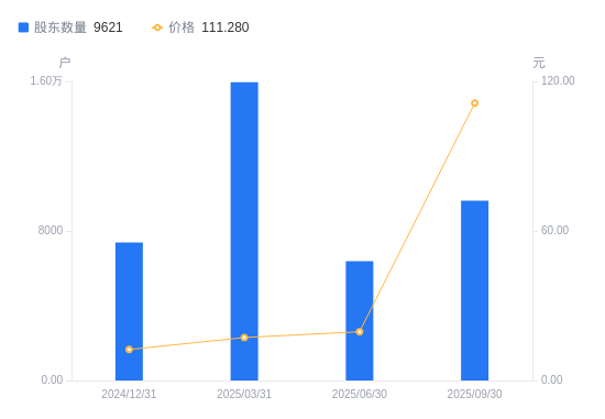 日期A股户数(户)流通A股户均持股数(股)户均持股市值(万元)2025-09-30962113936.18155.082025-06-30638021015.6741.112025-03-31159628399.9514.472024-12-31738418158.1822.592024-09-30824816256.0619.722024-06-30894214994.4117.472024-03-31890115063.4823.272023-12-311140911752.1319.932023-09-30610421965.9234.352023-06-3064145226.077.95