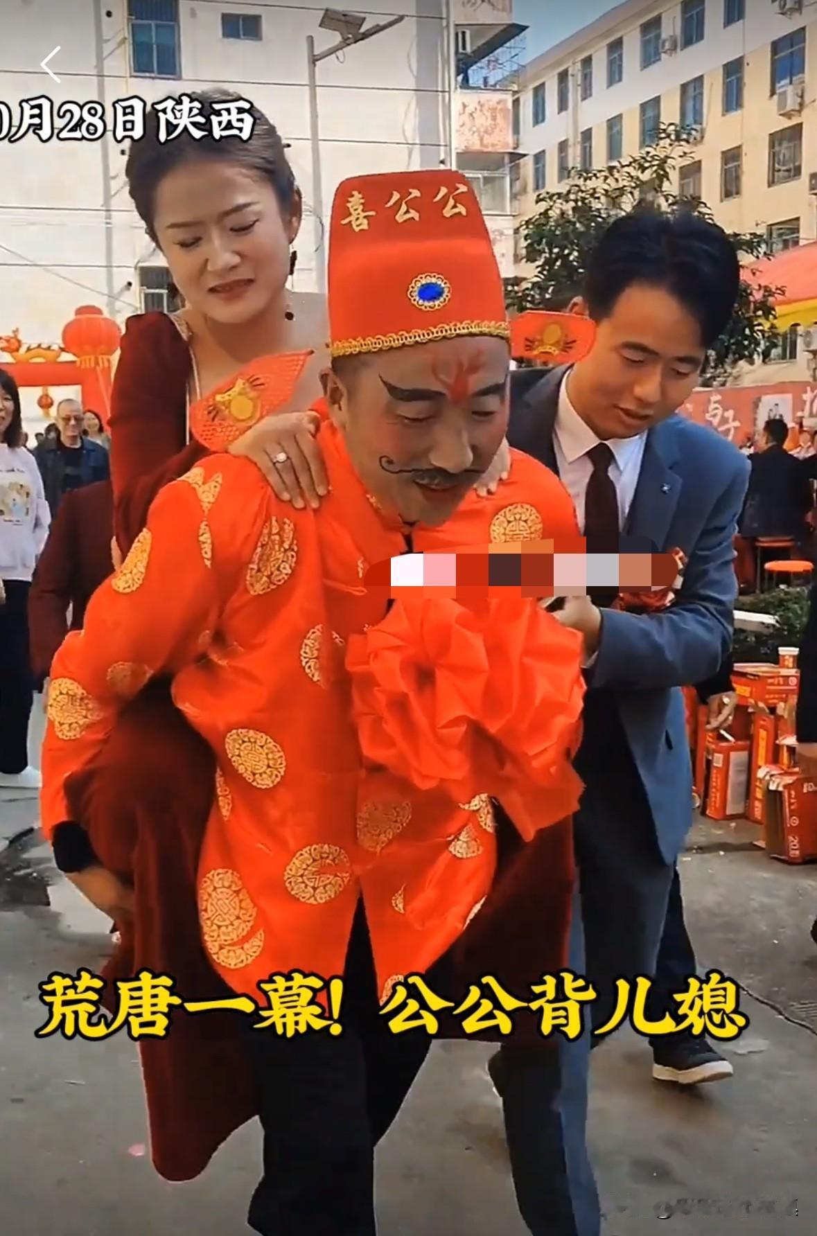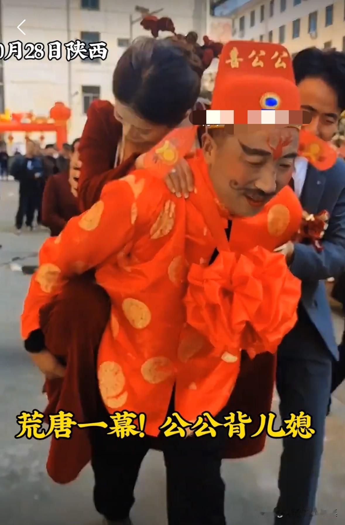 陕西一对新人结婚,习俗是让公公背着儿媳妇进门。 儿媳妇在公公背上手捂着胸,一脸痛苦相,可能也是觉得不好意思吧。 公公穿着红外套,胸前绑着一个大红花,戴个红色的状元帽,脸上画的跟小丑一样,背起新娘感觉也挺吃力的。 不明白为什么这都成习俗了,有什么寓意吗? 新郎在一旁护着新娘。 这习俗真雷到我了,不知道的还以为是公公娶媳妇呢。结婚背新娘