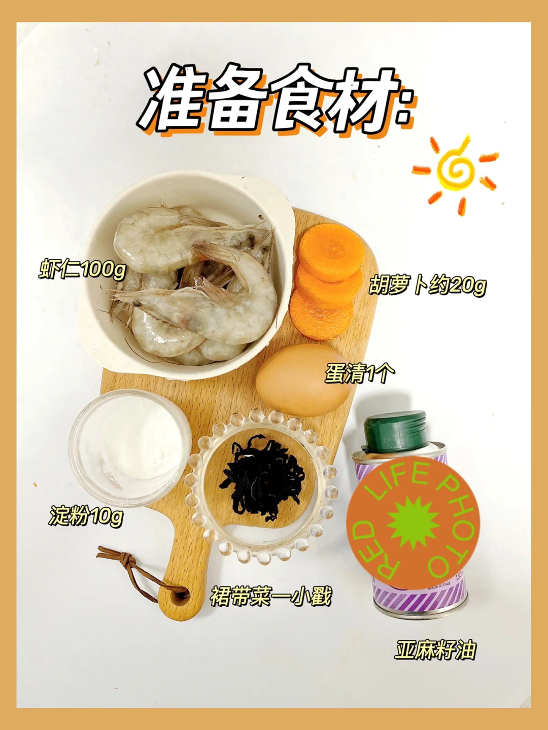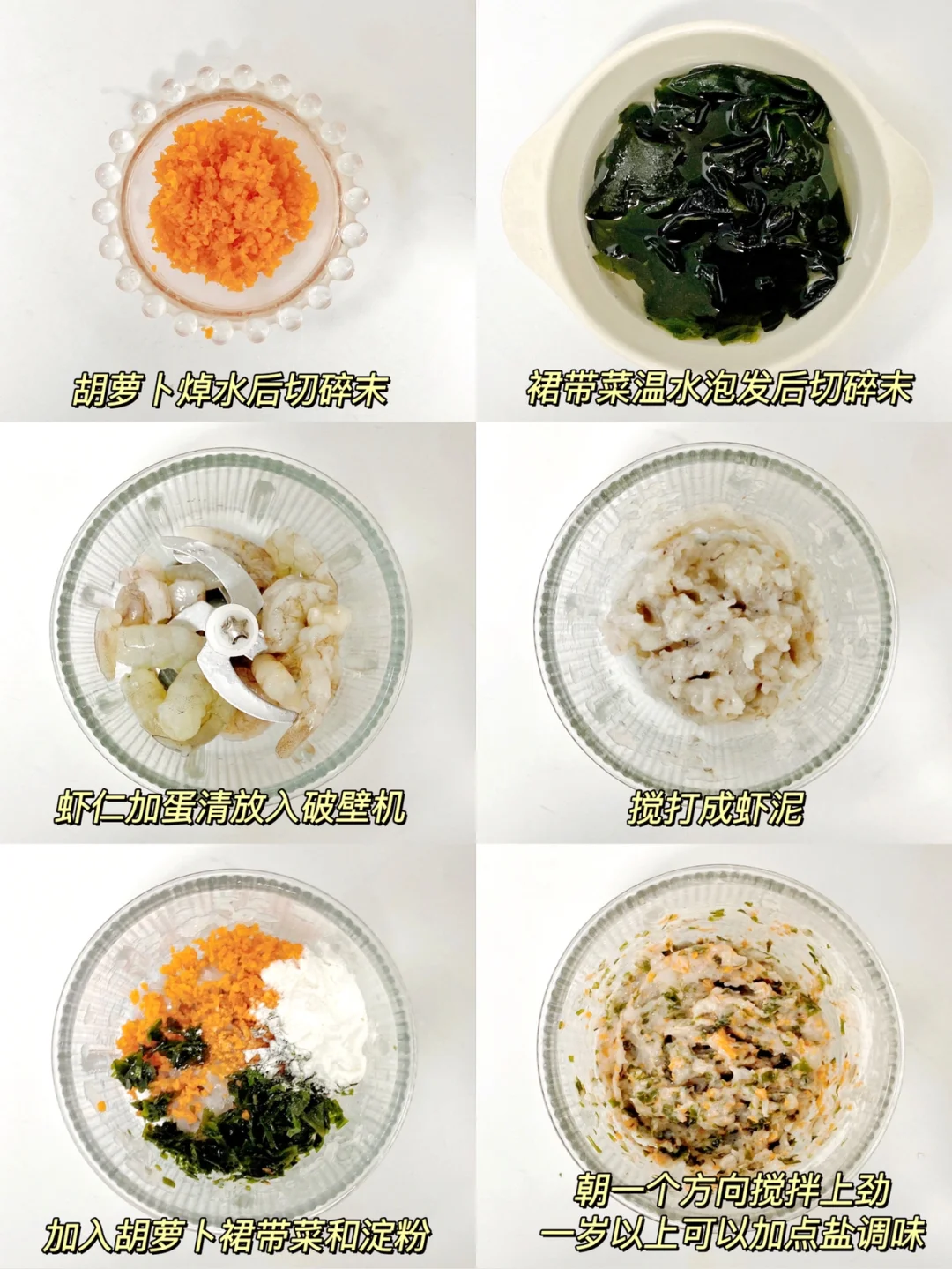 3⃣️虾泥中加入胡萝卜、裙带菜、淀粉,朝一个方向搅拌均匀,装入裱花袋。