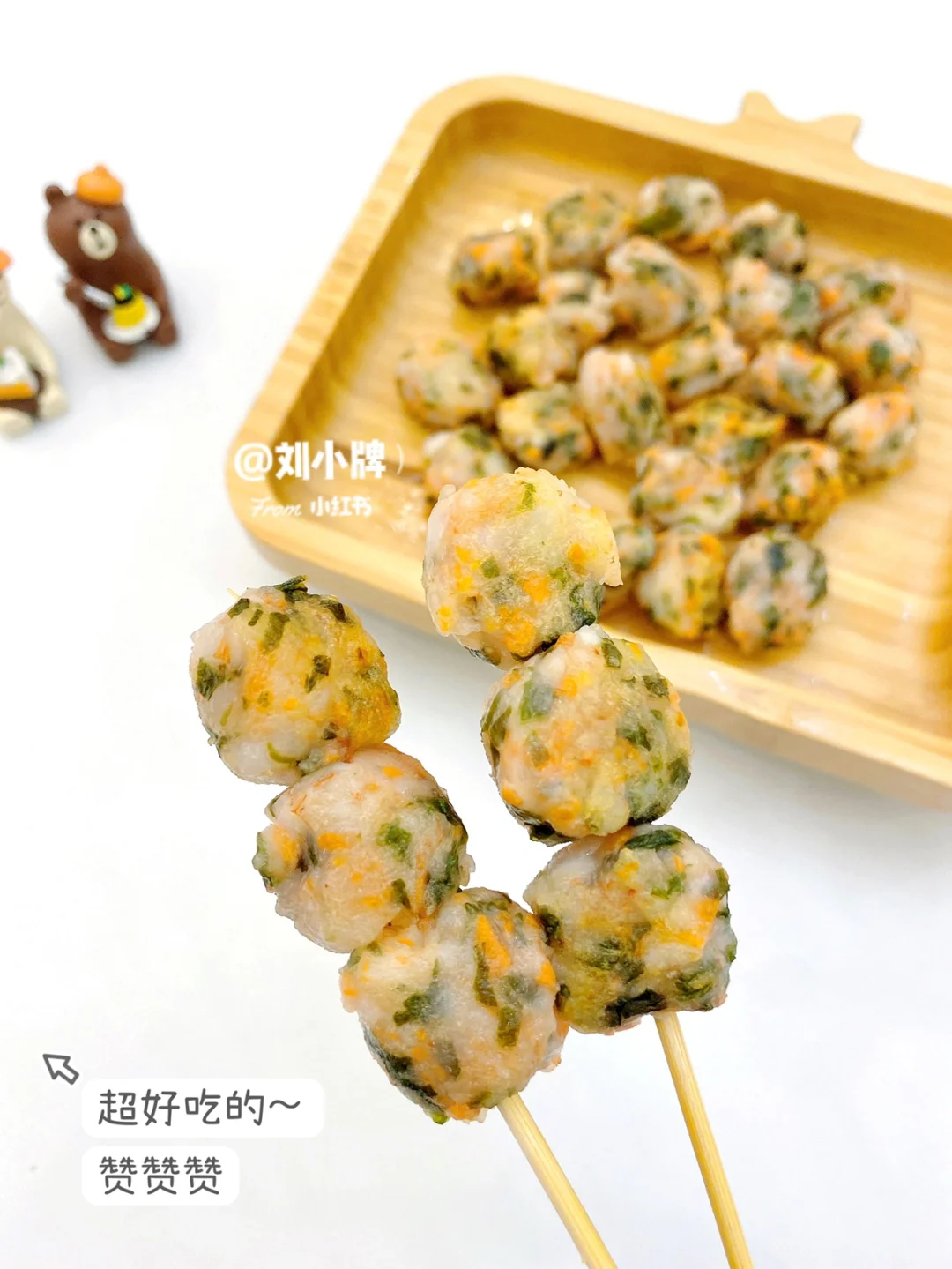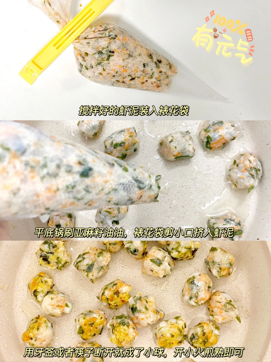 ✨这个虾肉容易熟,煎的时候用小火,底部凝固后滚动翻面,就形成可爱的小球啦~