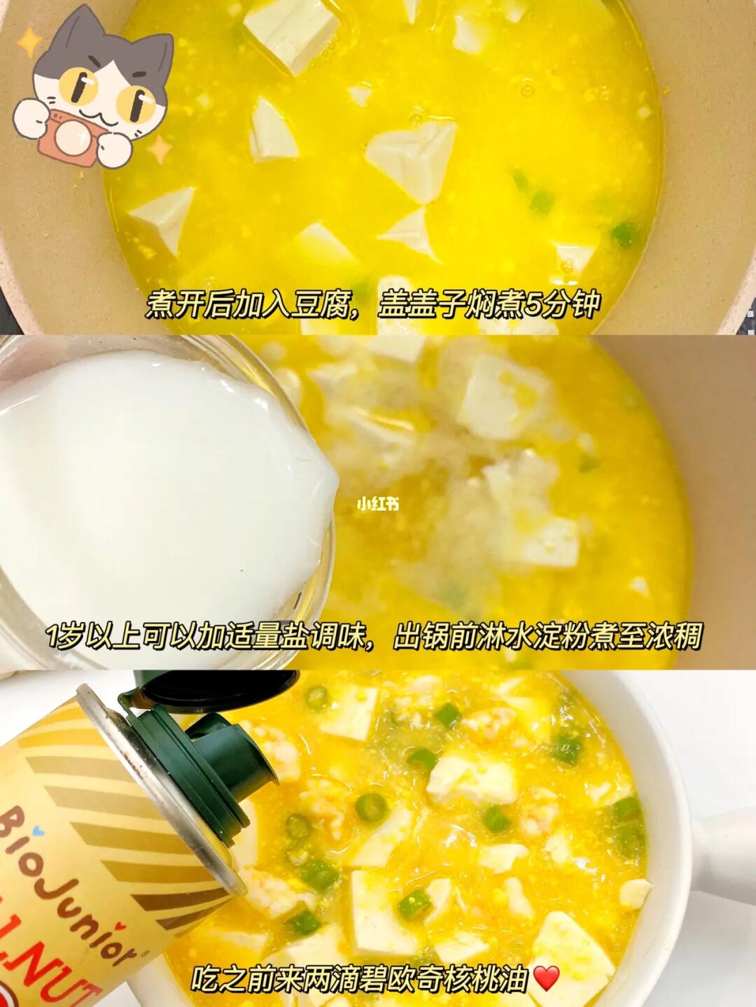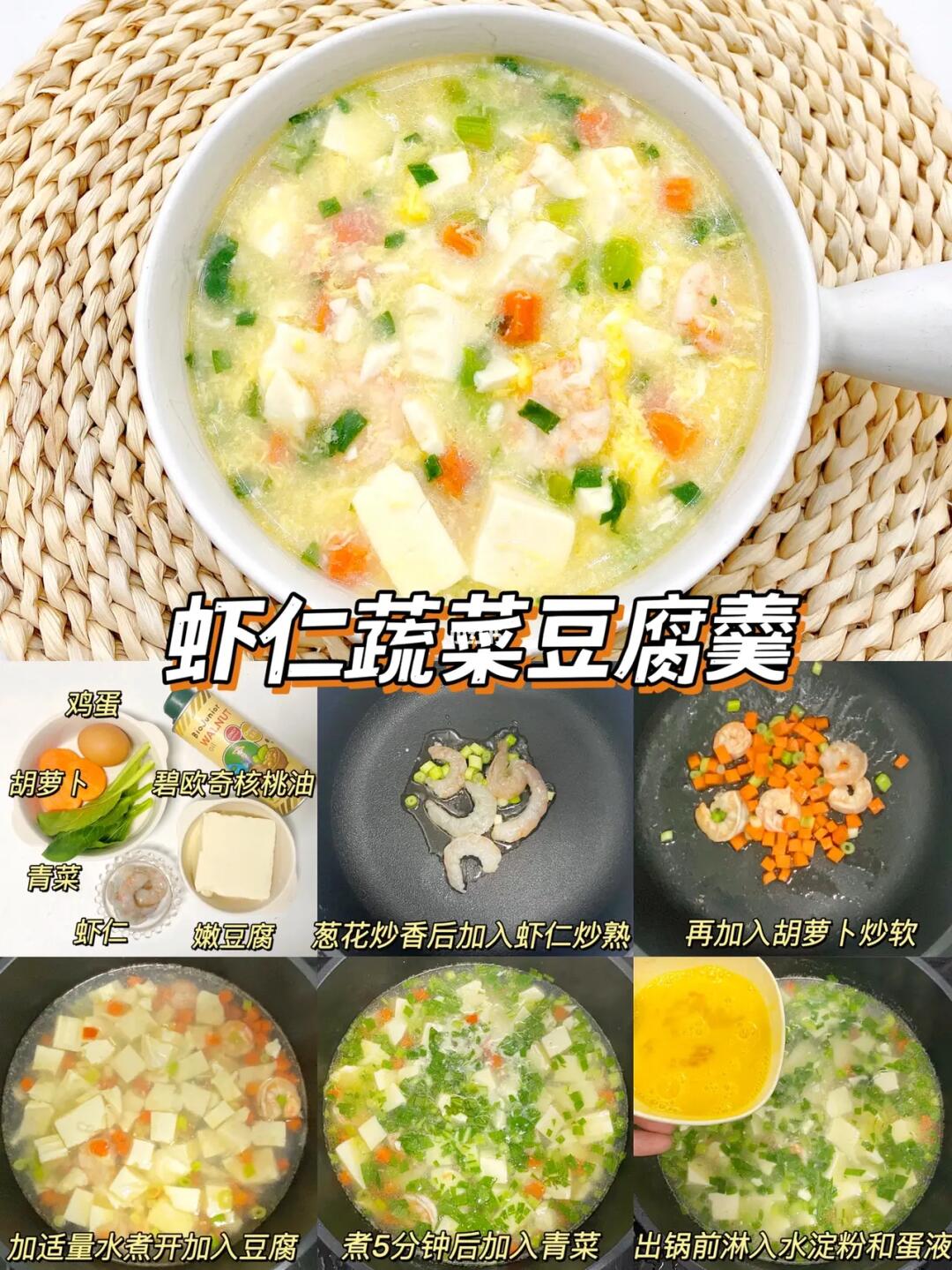 虾仁、青菜、胡萝卜、嫩豆腐、葱花、碧欧奇核桃油