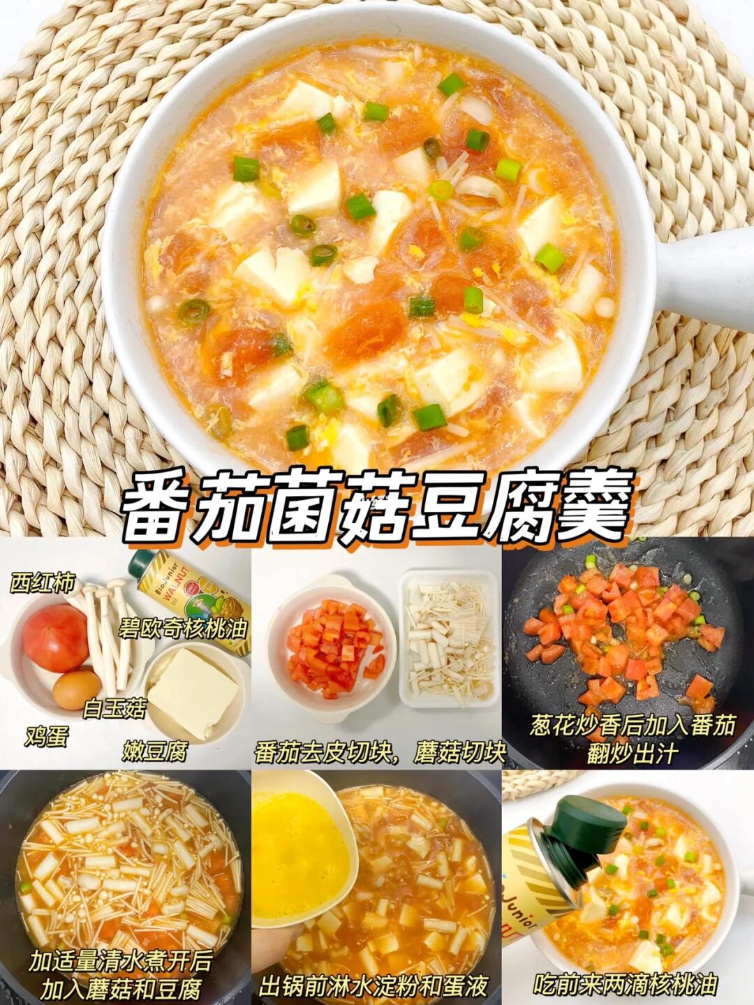 番茄、白玉菇、嫩豆腐、鸡蛋、葱花、碧欧奇核桃油