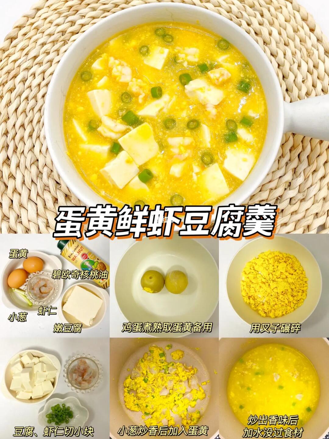 蛋黄、鲜虾、嫩豆腐、葱花、碧欧奇核桃油