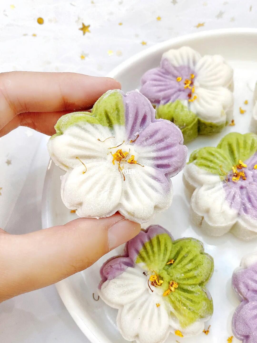 ▪️取适量山药泥分别加入紫薯粉和抹茶粉调色,根据模具的大小取三种颜色的山药泥混合,按扁包入果泥。