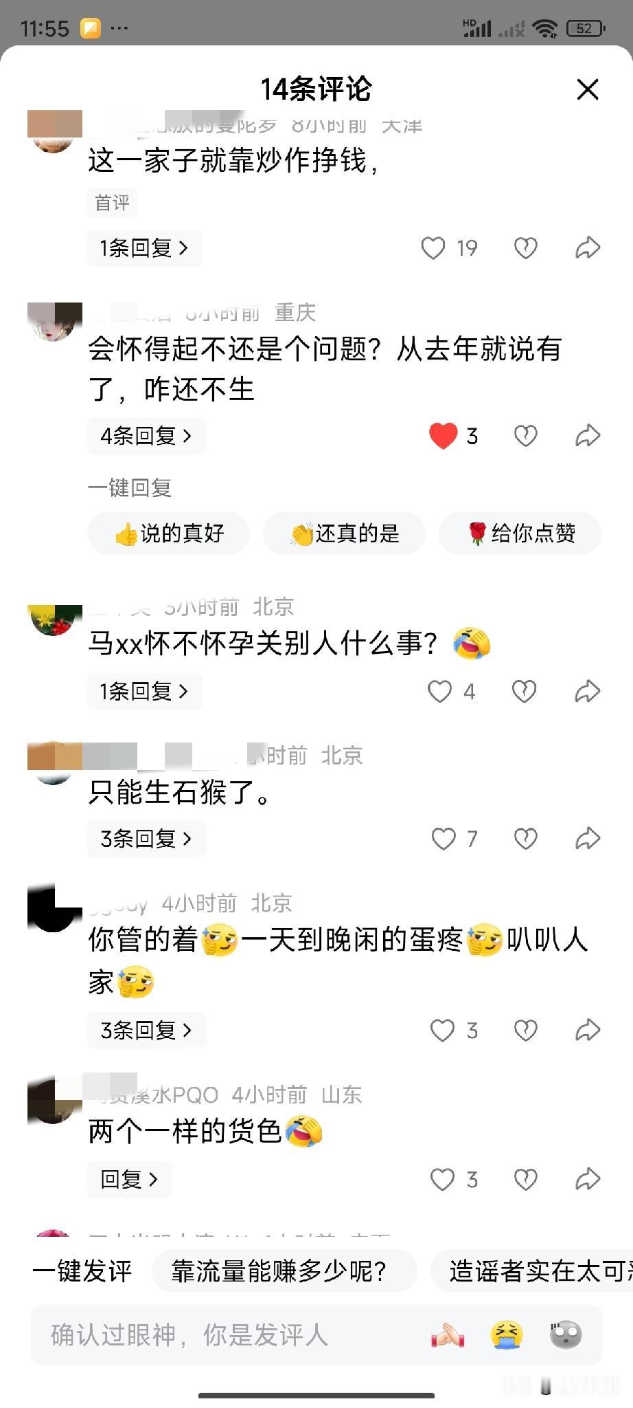 对这家人没有好感,为了带货制造各种话题,一年怀孕多少次,这次又是给外界制造怀孕话题,明明暗示,又不承认,你们使劲吵,我们使劲赚,婆媳都是玩这种梗的老手,这是聪明还是不自重? 有人说网民闲得,有人说黑子管得着人家怀孕吗?但我觉得没有谁想管,也不是网民闲得,而是他们自己为了流量,就差那一层裤衩了。 谎话➕戏精,看着就讨厌,为了平台的正能量,继续封就对了。