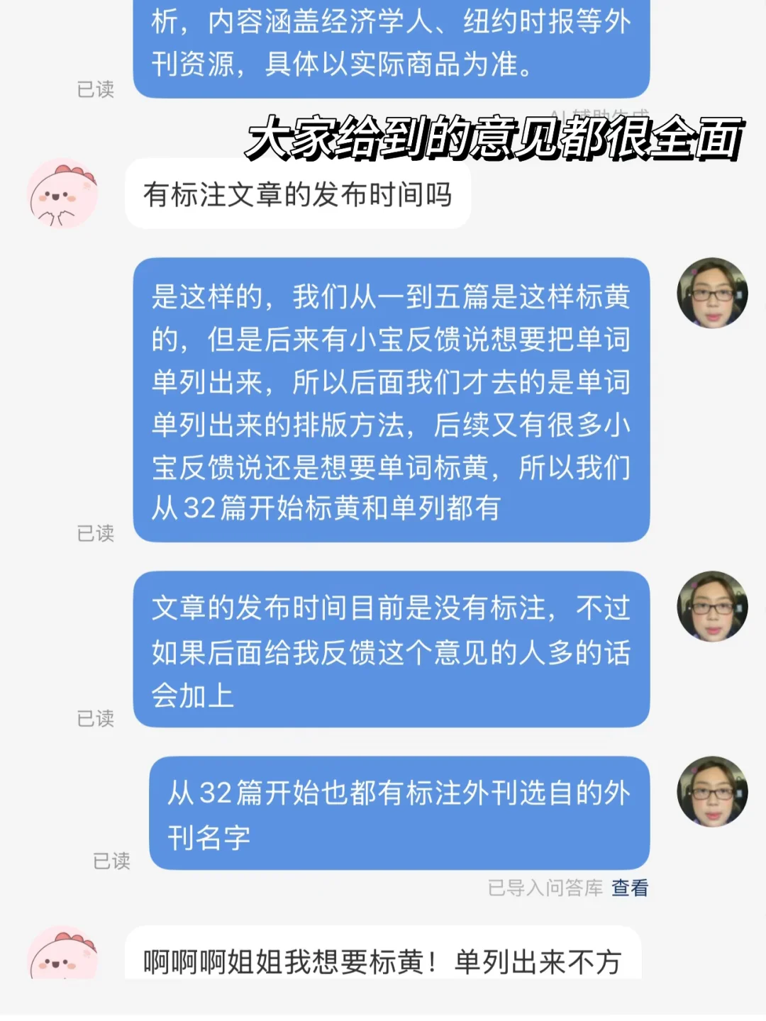 大家不仅仅是我的顾客,更是我贴心的朋友,购买了资料的大家耐心地为我提供建议,我也十分听劝,现在每一篇的外刊符合考研考纲5500的词汇都会在文中标黄,并且在段落最后单独列出。