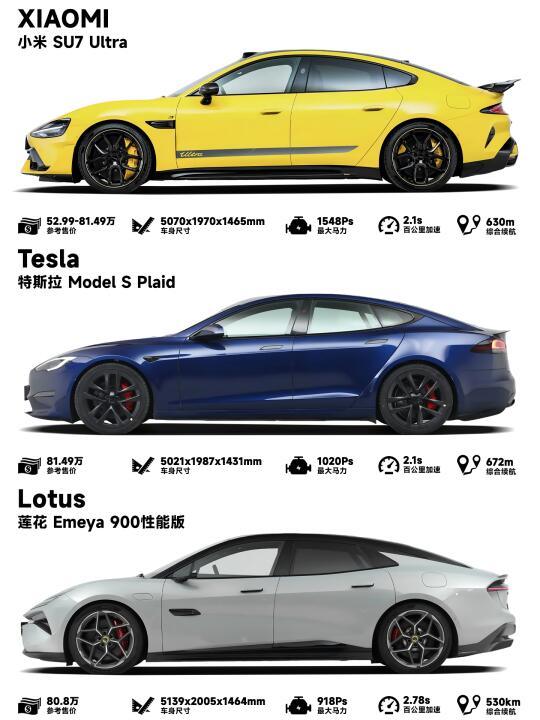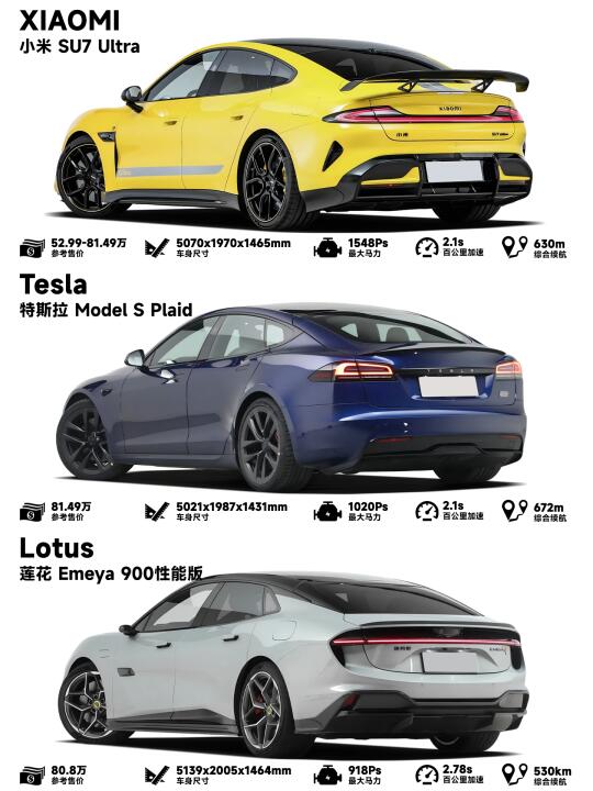 80万预算,实力与颜值并存的三款纯电高性能四门车:小米SU7 Ultra、特斯拉Model S Plaid和莲花Emeya 900性能版,你会怎么选?