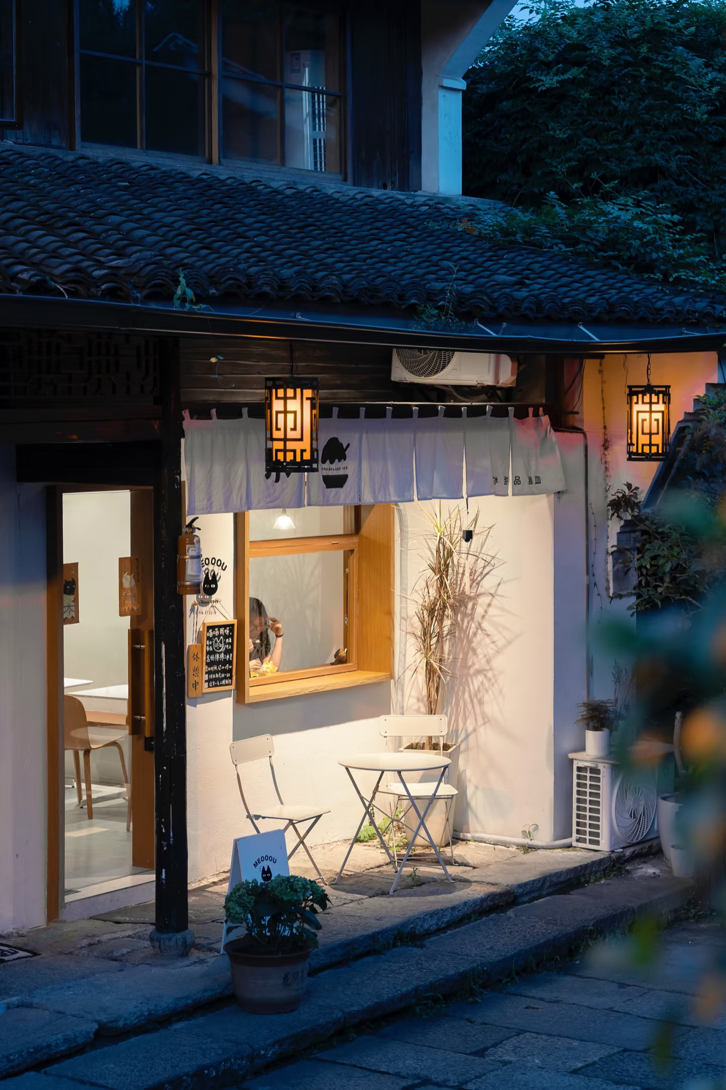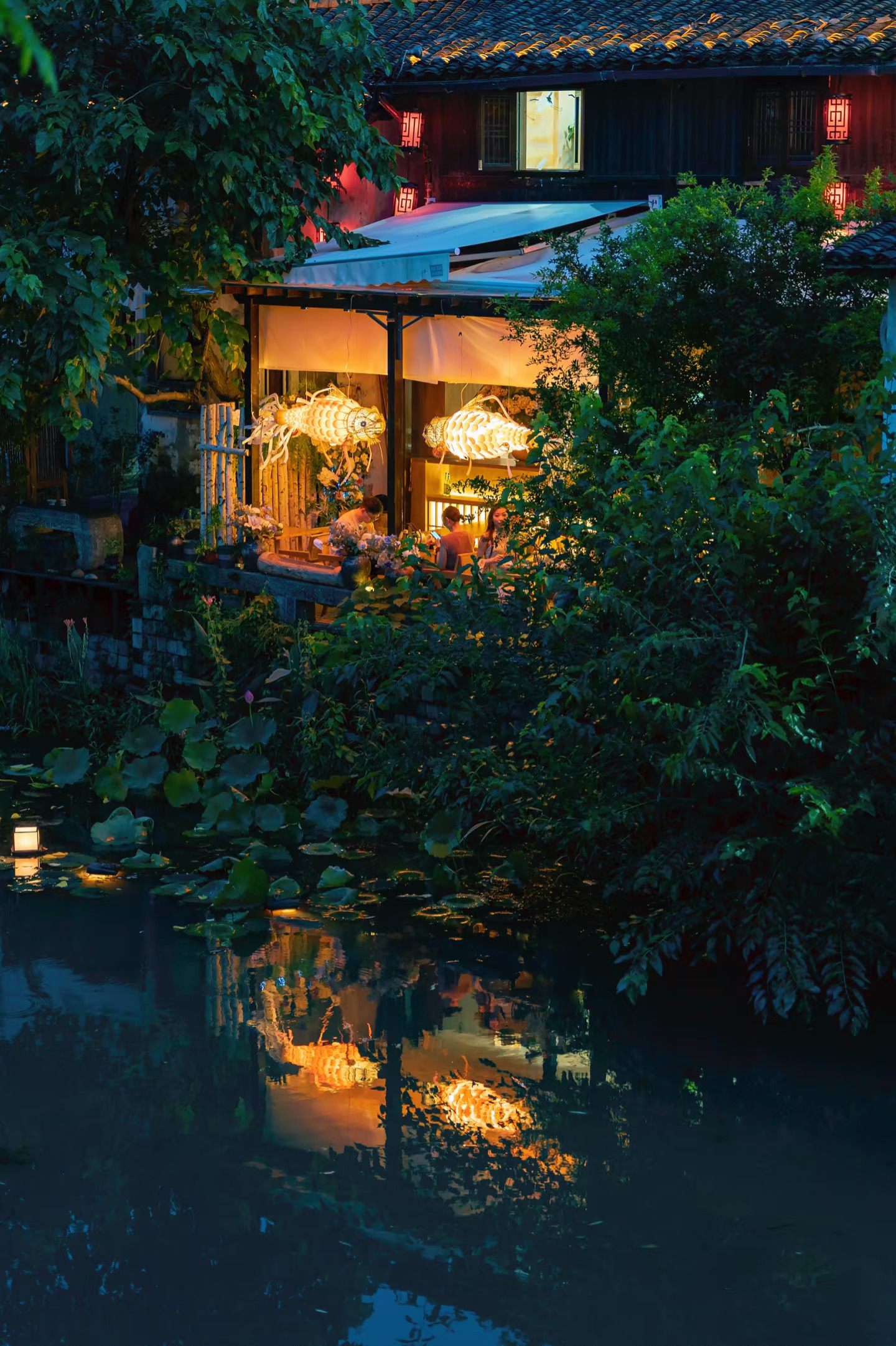 运河边的灯笼串成星河,白墙黑瓦浸在水里。蹲在石阶上拍对岸,水波晃着光像一幅水墨画