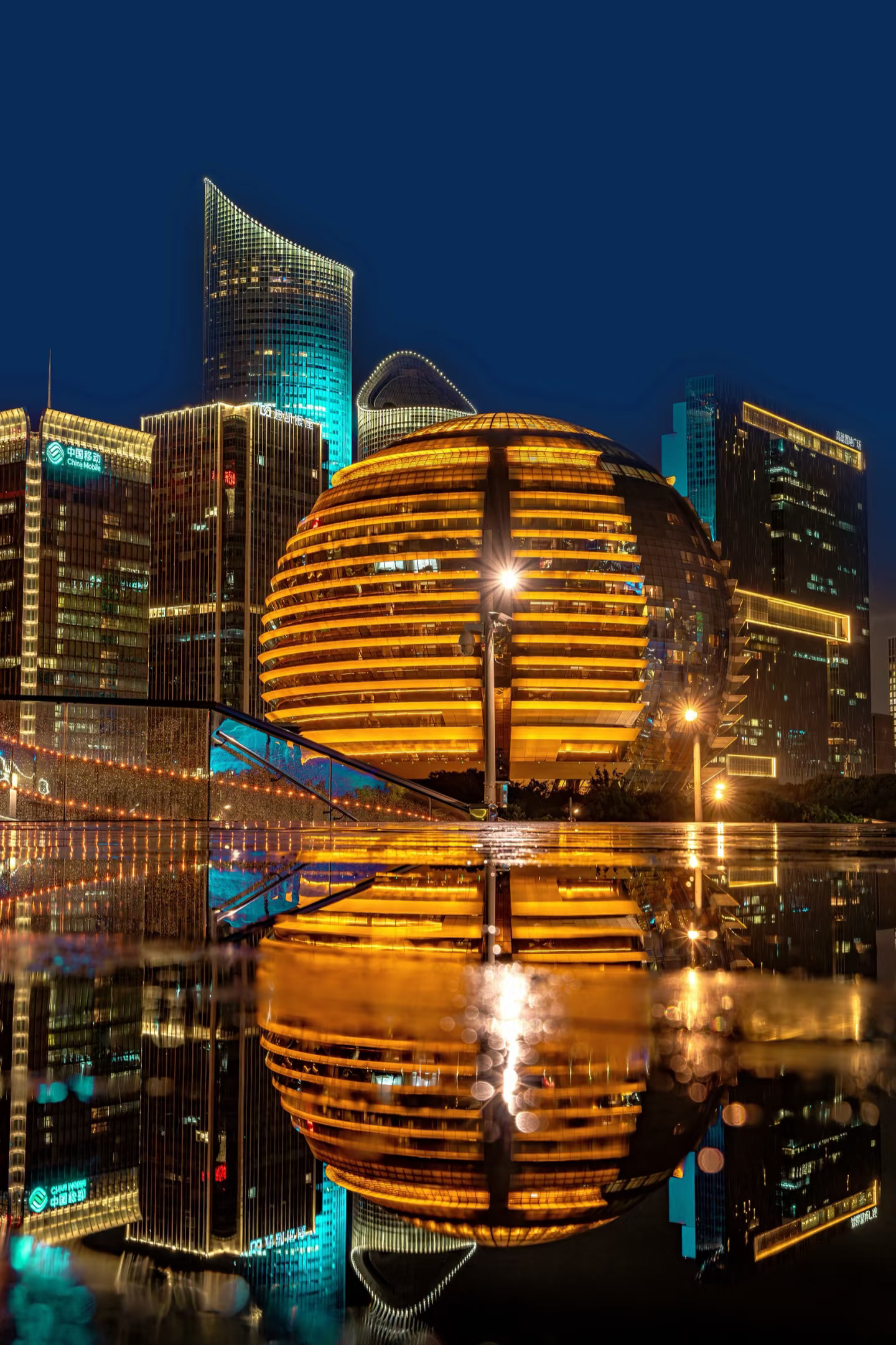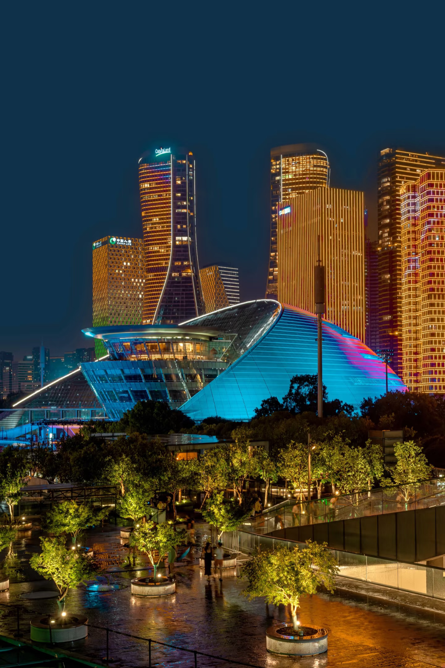 钱塘江的夜景在这里铺开,灯光秀亮起时像给江面披了彩绸,拍江景与对岸建筑彩色灯光调得像水彩画