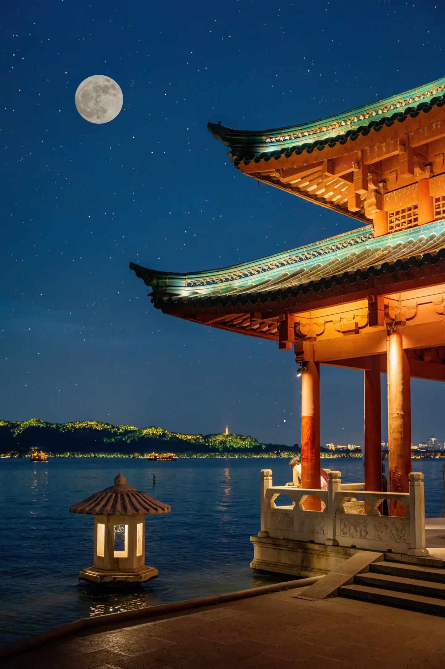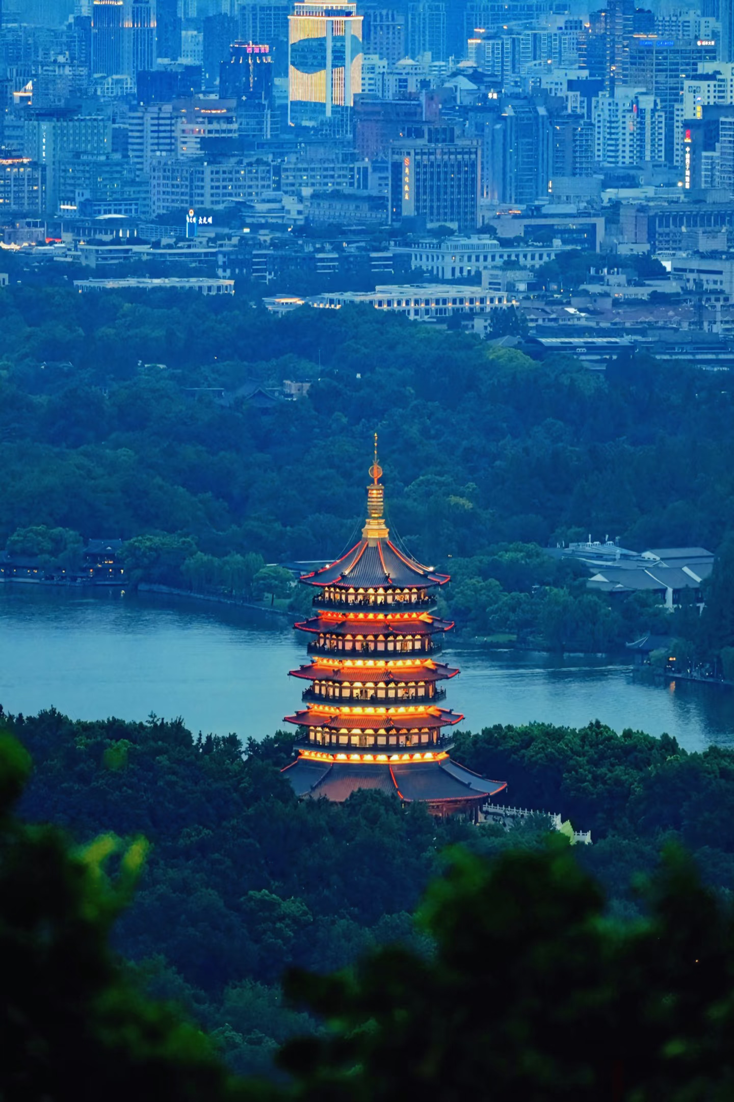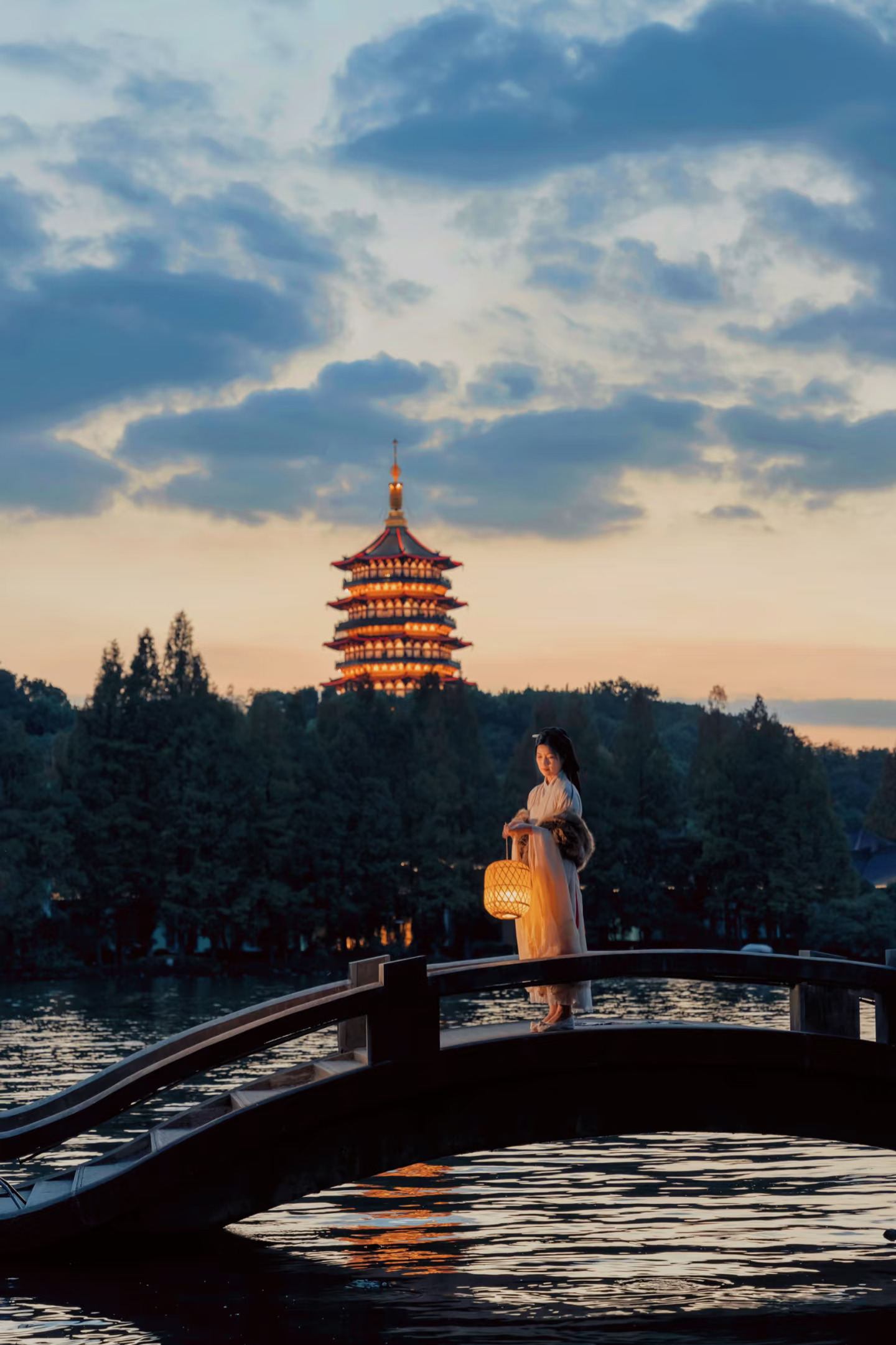 雷峰塔亮灯时,站在桥上拍塔影入水,湖面像铺了块蓝宝石,把蓝调夜色里的塔影衬得格外清透,连水波的褶皱都有诗意
