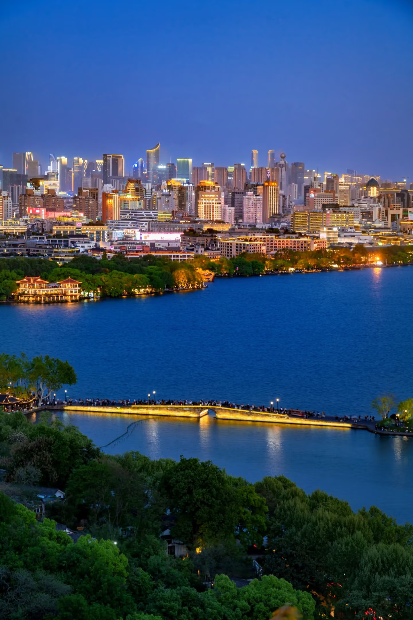 爬30分钟到观景台,整个西湖夜景铺在眼前。远处的灯火像撒在湖面的碎钻,山影、湖光、城灯层次分明