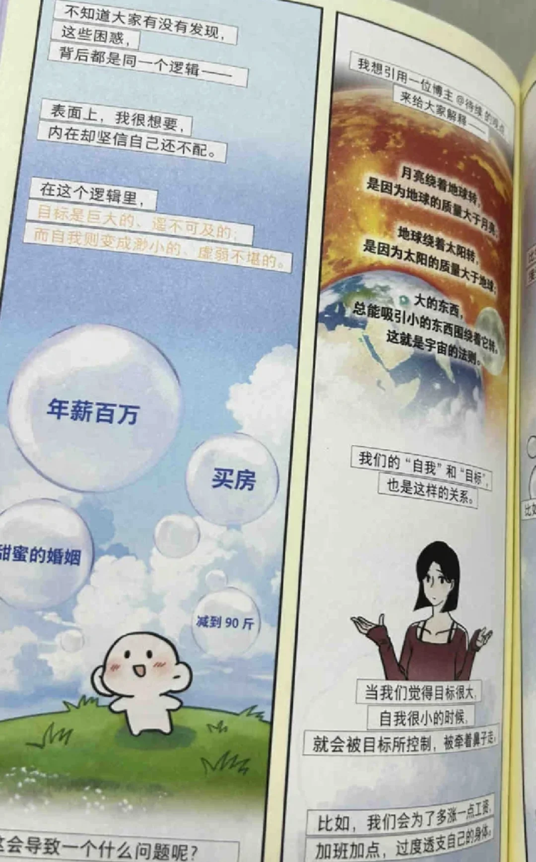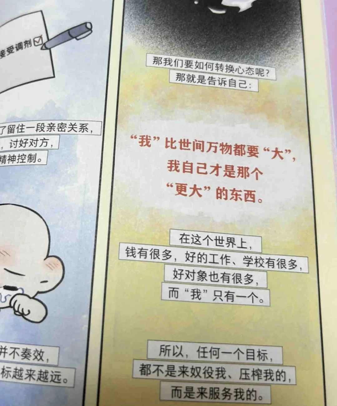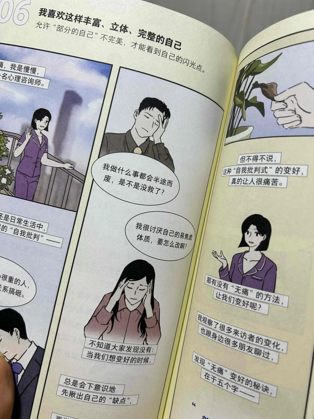 📍“在这个世界上,钱很多,好的工作、学校、对象很多,然而我“我”只有一个。任何一个目标都不应该来奴役我压榨我,而应该是来服务我的。” ——————🎄 周轶君说,很多年轻人抱怨生活没意思,不知道自己到底喜欢什么。 / 🙃这也许是消费主义造成的后果。因为我们从小就被告知,人生的目的就是按部就班地读书工作赚钱,而不是在这个世界上创造什么。 / 🙃消费主义用各种手段诱导和迫我们花不必要的钱,同时为了能支付高昂的生活成本,又不得不把自己投入到繁重的工作中,将人变成机器。更可怕的是我们的精神世界也因此变得荒芜,没有心力去思考和寻找真正想要的的人生。 / 🙃回想我们大多数人都是在安全、从众的选择中度过的: 努力学习是为了上好大学,上好大学是为了找一份体面的工作,然后努力攒钱、买房、结婚、生子,然后再给子女攒钱.… 在这样的生活模式中,人的内心很难找到自己的力量源泉,去支撑自己真正想追求什么、实现什么。 — 😌所以警惕消费主义陷阱,其本质是向内探寻内心,找到自己的人生支点。 希望大家都能时刻提醒自己,保持精神的丰盈和完整,要寻找自我,不要随波逐流不要糟蹋它~ ————🌷 这和我最近在看的心理学绘本《我喜欢这样的自己》讲的如出一辙: •“社会给的巨大目标(百万年薪/学历/甜蜜的婚姻/减到90斤…),会让自我变小,个人会被社会裹挟被牵着鼻子走。” •“在这个世界上,钱很多,好的工作、学校、对象很多,然而我“我”只有一个。任何一个目标都不应该来奴役我压榨我,而应该是来服务我的。” / 📘这本心理学书 不是鸡汤,不是大段的心理学理论 而是真实发生在咨询室里的18个心理困境故事 - 💬它有点像你情绪低落时的急救本,也可以把它当作“重新成为自己的朋友”这件事的第一步 ———🌷 你要明白,就算你不“完美” 你依然可以慢慢地狠狠地爱上自己 就算不那么好,也可以被喜欢,也值得被善待 🌷“走在一条自我救赎的路上吧:我可以,我选择,我负责。” 🌷“去做一件能让你全身心投入的产生心流的事,越多越好。” smart is new sexy! 一起加油(ง •̀_•́)ง,共勉之~ [萌萌哒R]欢迎关注,这里会: [一R]日更闪光金句/经典书摘 [二R]来这世间一趟,要看看太阳呀 [三R]适度思考,链接现实,好好开干!