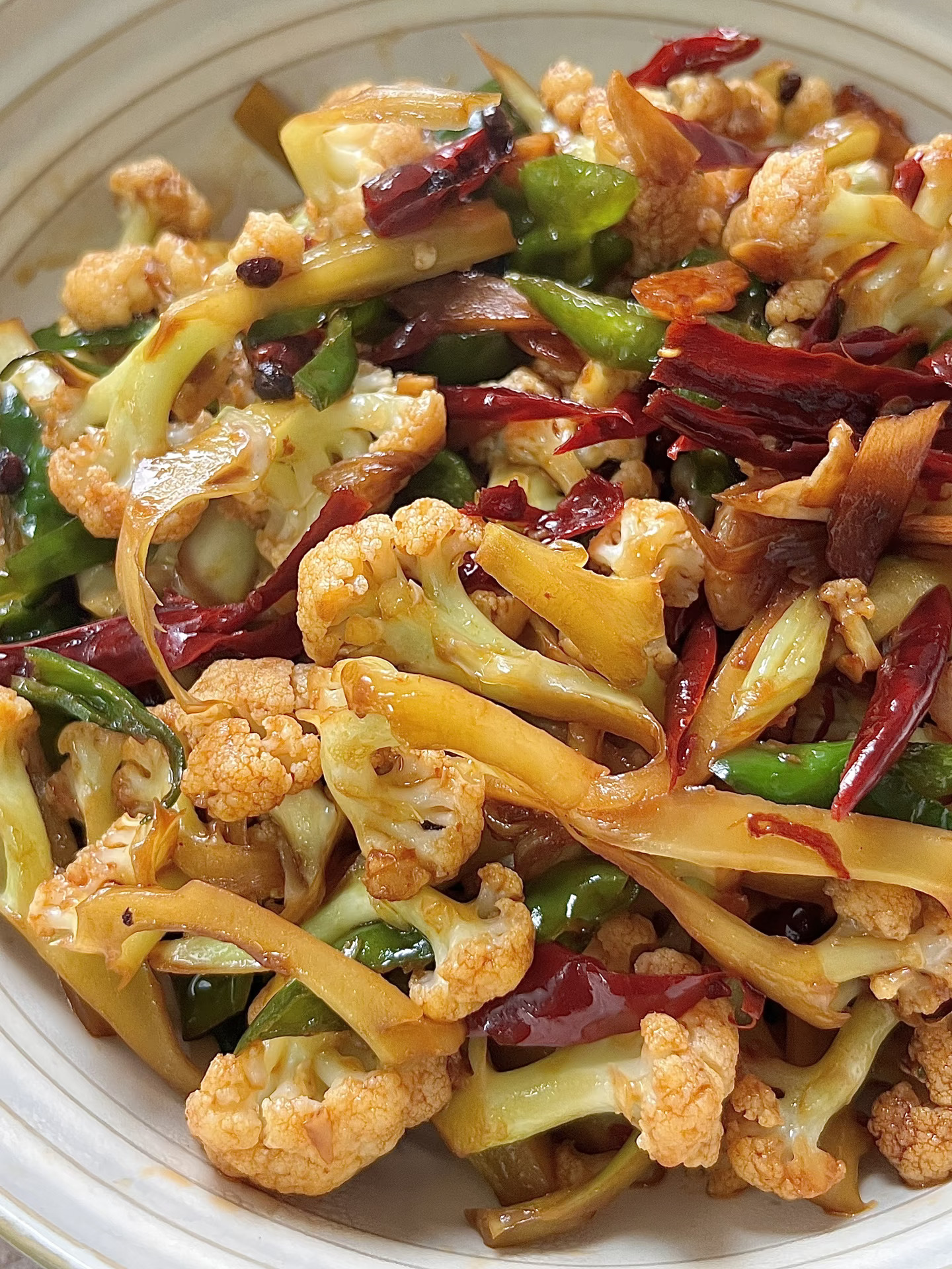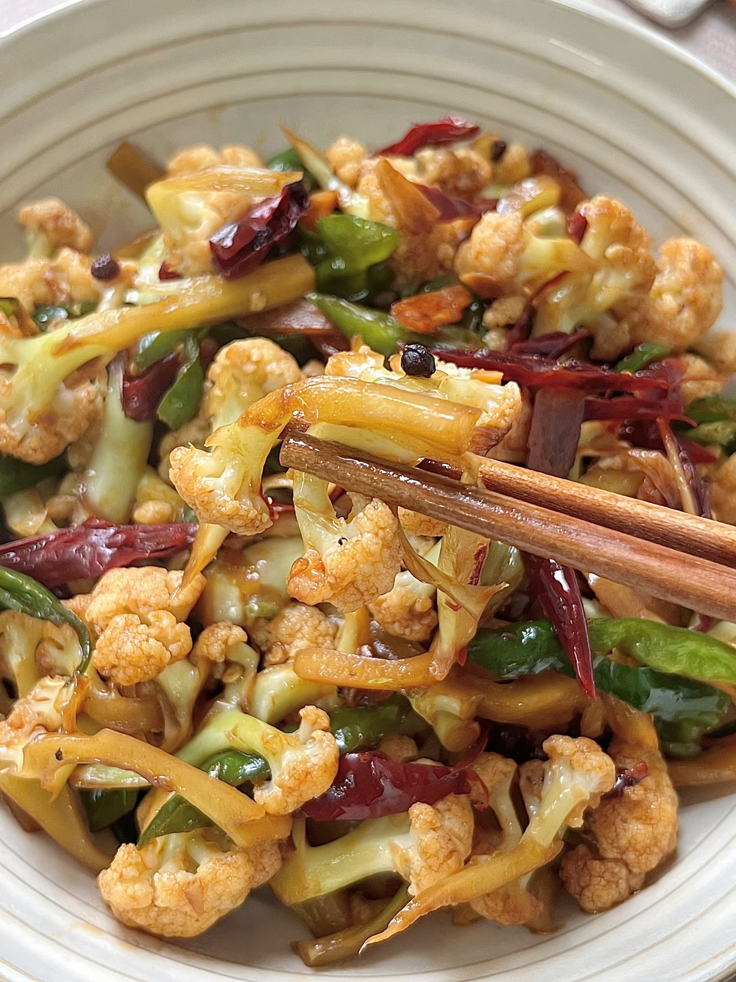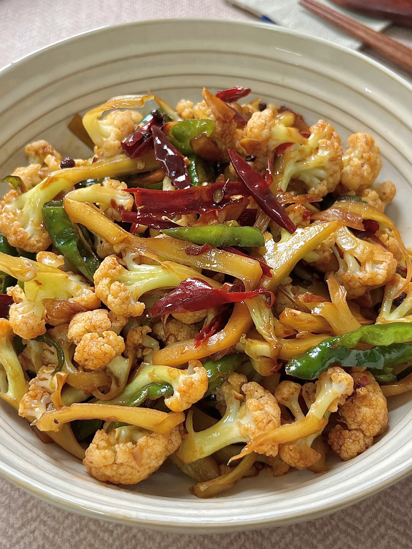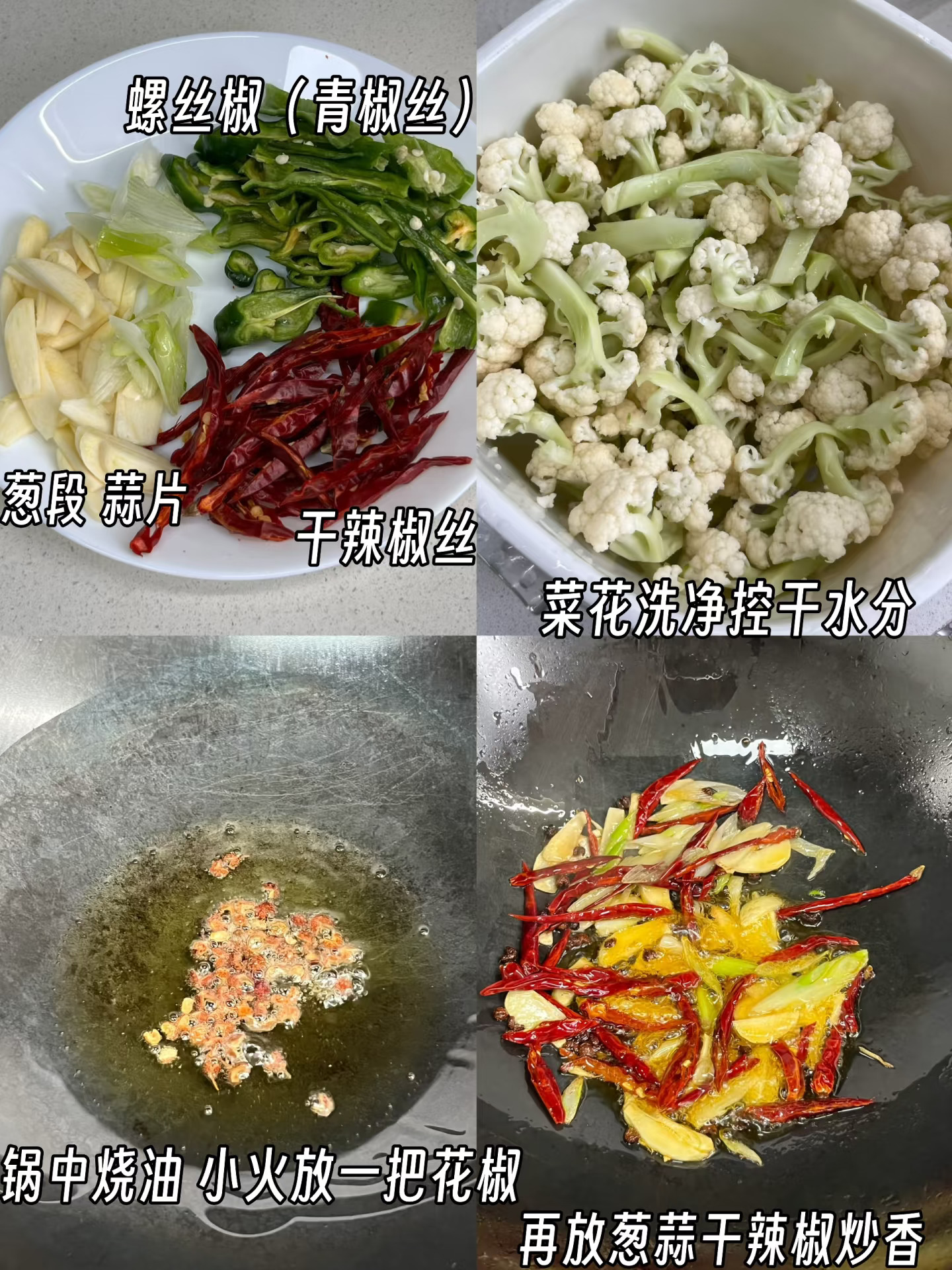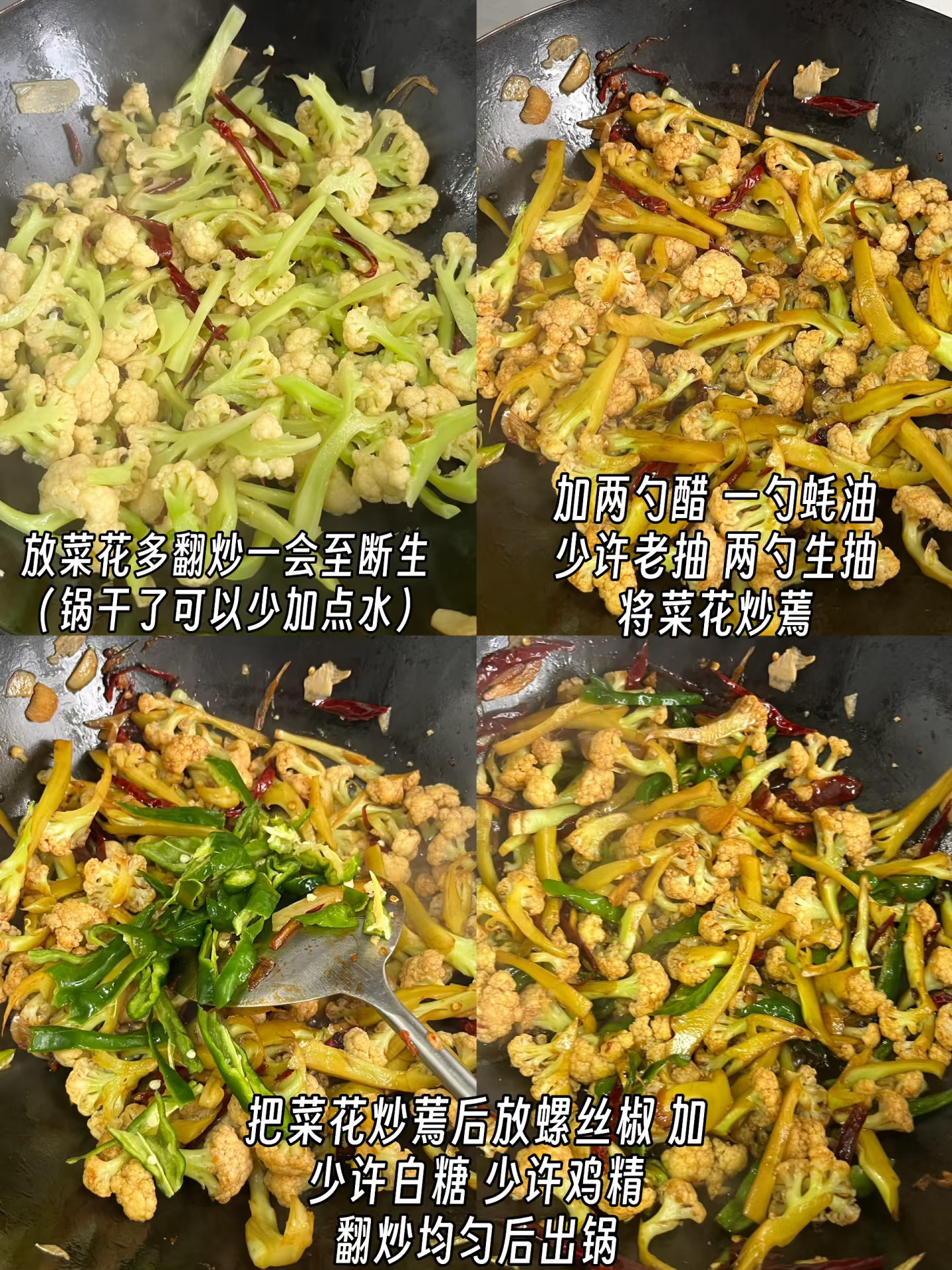 附做法: 1️⃣准备干辣椒丝、葱段、蒜片、螺丝椒(不能吃辣放青椒)菜花洗净控干水分备用; 2️⃣起锅烧油,小火炸香一把花椒,再放干辣椒丝、蒜片、葱段炒香 3️⃣放入菜花多炒一会至断生,加两勺醋、两勺生抽、一勺蚝油、少许老抽翻炒均匀 4️⃣将菜花炒蔫后,放螺丝椒,加少许白糖、少许鸡精炒匀出锅✅ -